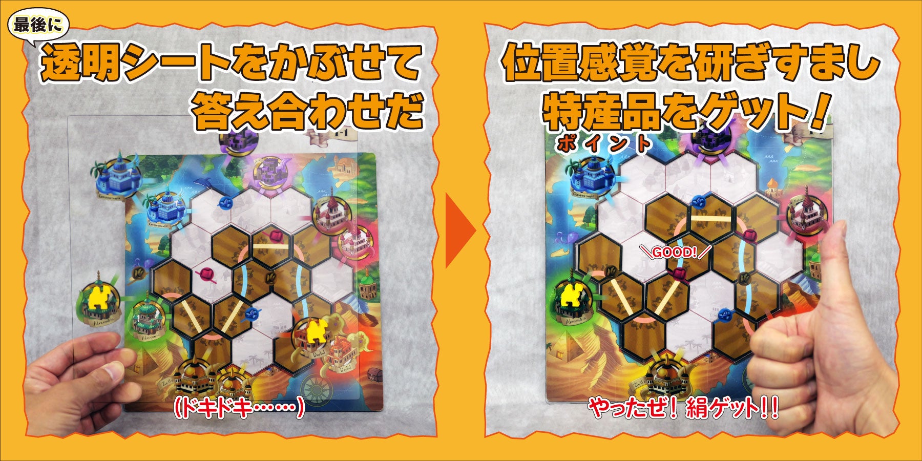 答え合わせは特産品の位置が描かれた透明シートを、ボードに重ねて点数を確認します。