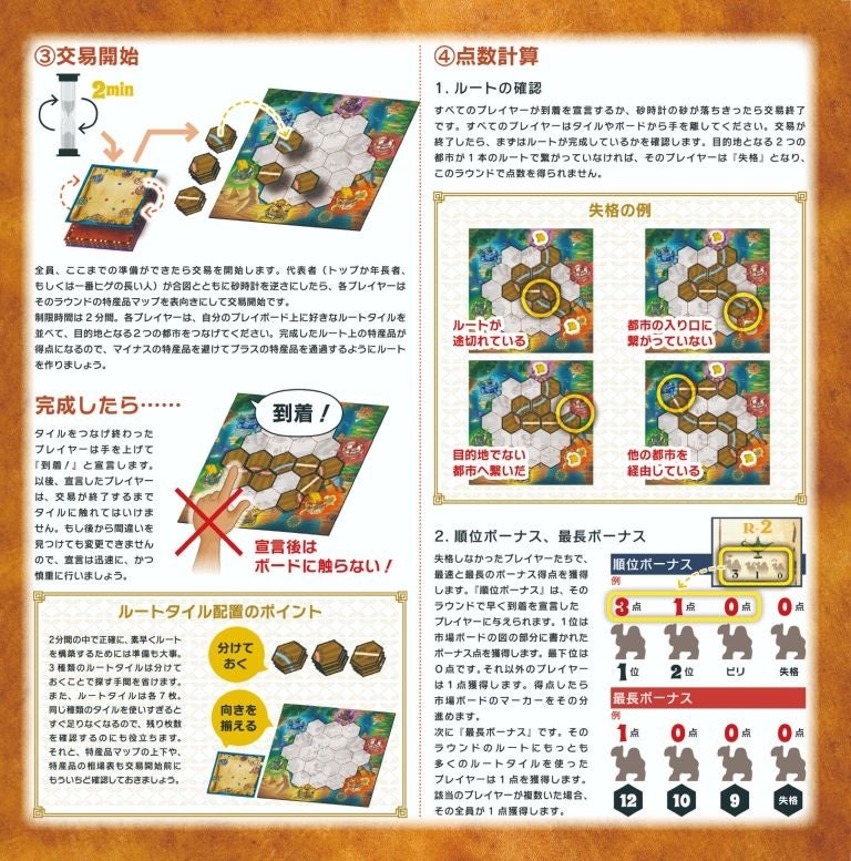 それぞれにプレイヤーボードが配られ、2分間の制限時間の中で、だいたいの位置しかわからない特産品を獲得出来るようにルートタイルをつなげていきます。