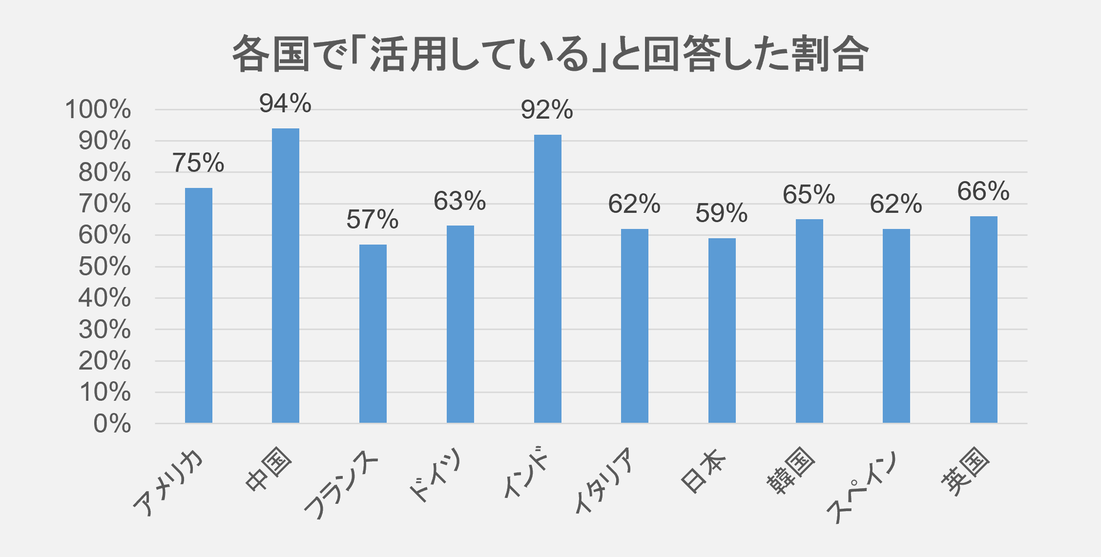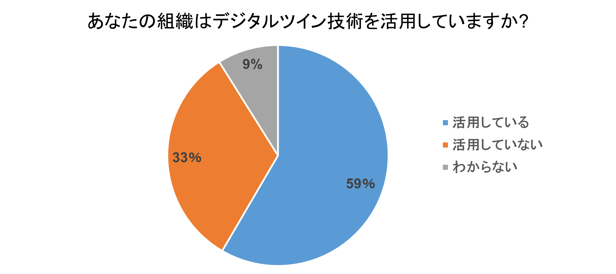 回答:日本人の約6割が「デジタルツイン技術を活用している」と回答。全体平均は約7割程度が「活用している」と回答していることから、世界的に見たときに「日本のデジタルツイン技術の活用はやや遅れている」状況であり、10カ国中9位であることが明らかになった。なお、「活用している」という回答率が最も高かったのは中国の94%、次点がインドの92%となった。
