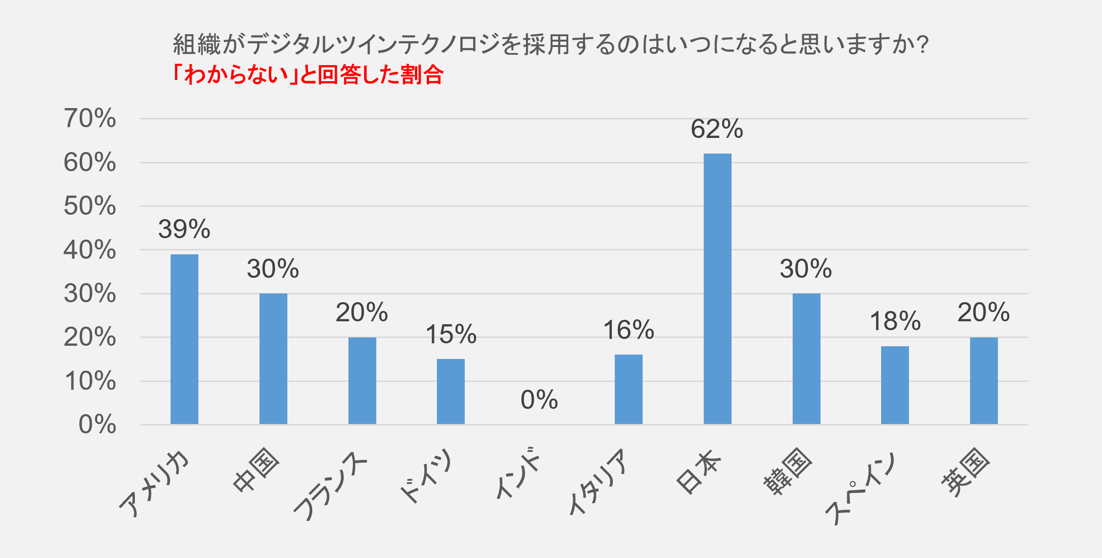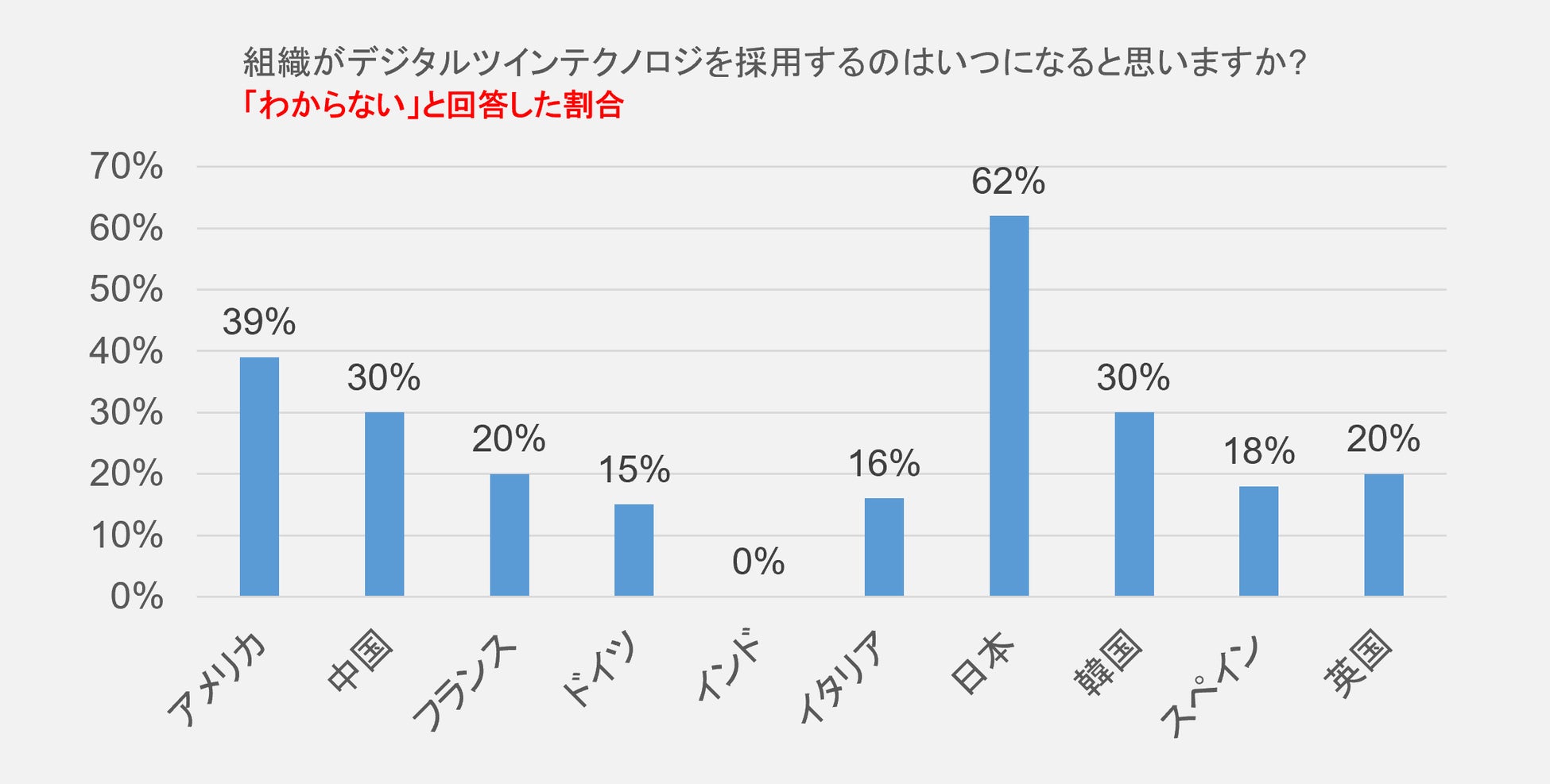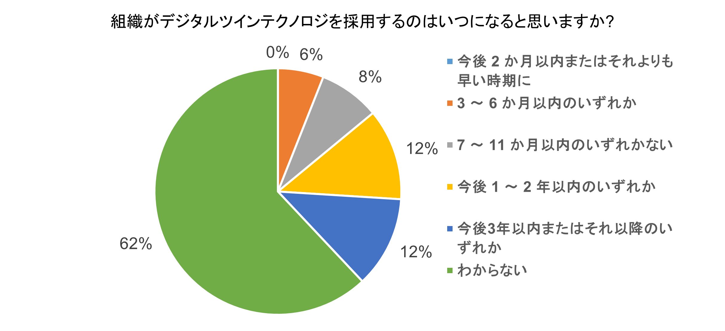 ■デジタルツイン技術が採用されるのはいつになるかという問いに対して「6か月以内」と回答した日本人の割合はわずか6%(全体平均は12%)。そのうち「今後 2か月以内またはそれよりも早い時期に」と回答したのは0%。また、「わからない」という回答が62%と、諸外国と比較した際に倍以上の結果となった。