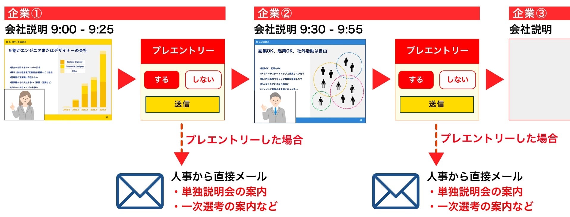 1企業の説明会が終わるごとにプレエントリーを提出することができ、