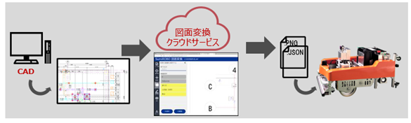 ・CADデータから墨出し作業情報を抽出して、データ変換する必要があります。この作業をお客様自身でいつでもできるように、図面変換のクラウドサービスを用意しました。