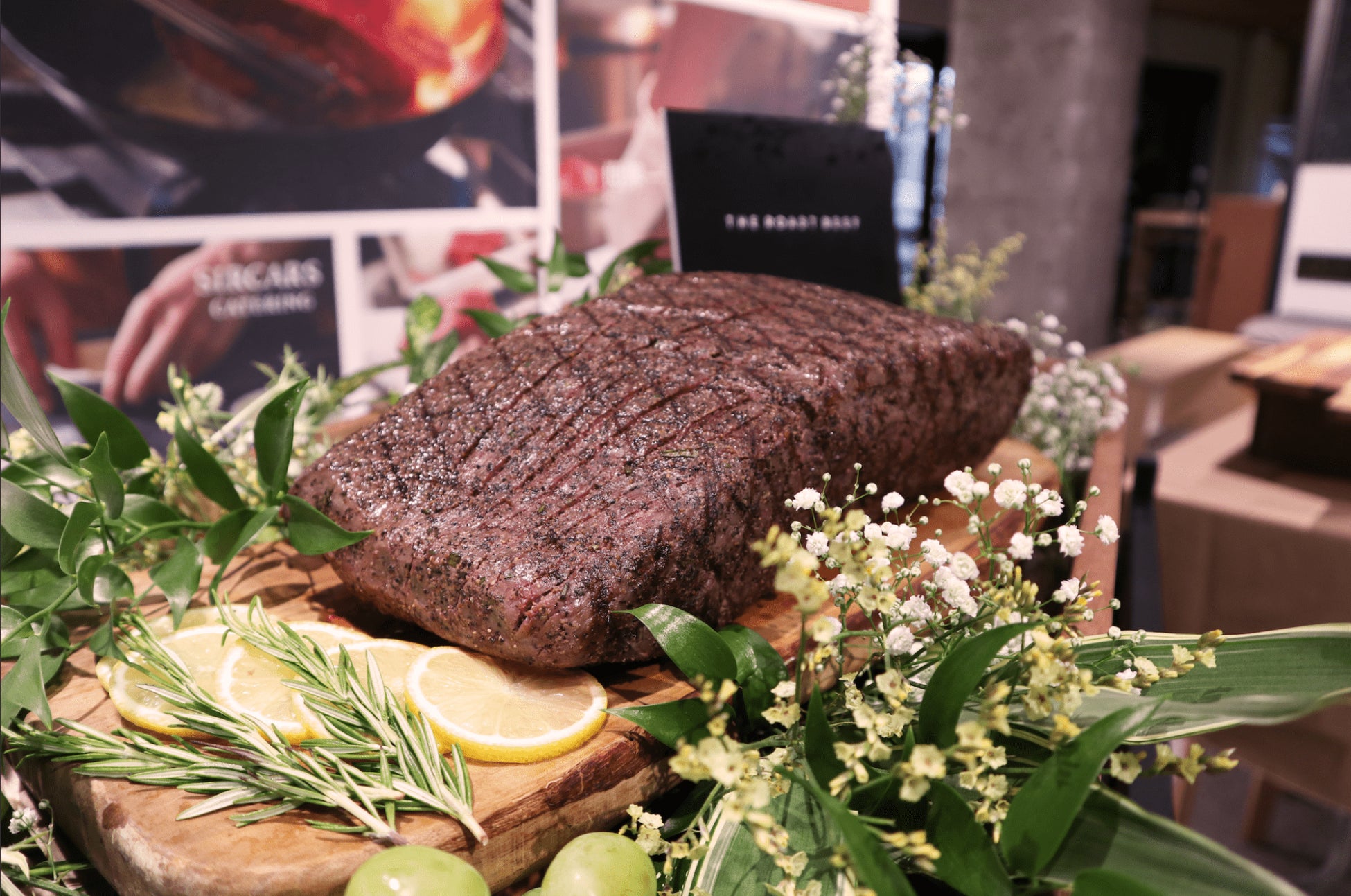 このプランの想いを伝えるためのバックパネルの前で、ローストビーフの塊がお花や果物で彩られたBOXに入れられ、お客様の前に登場します。