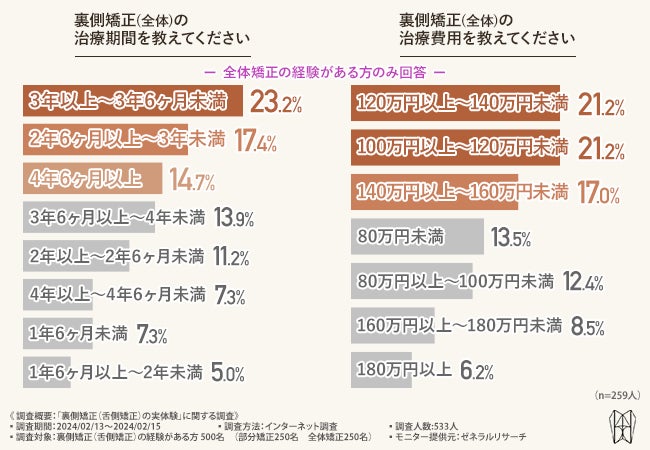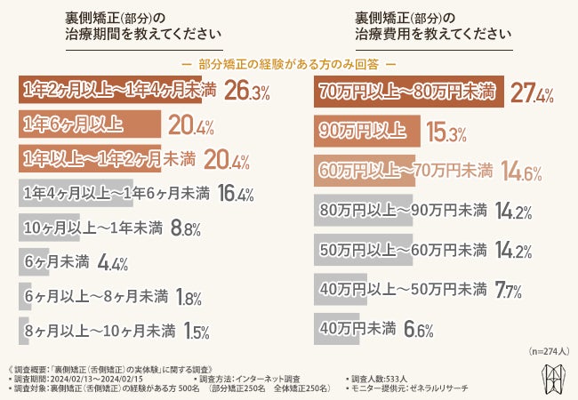 部分矯正を裏側矯正で行うと約半数の方の治療期間が1年2ヶ月程度、約4割の方の治療費用が70万円程度、全体矯正を裏側矯正で行うと約4割の方の治療期間が3年程度、約4割の方の治療費用が120万円程度という傾向が示されました。