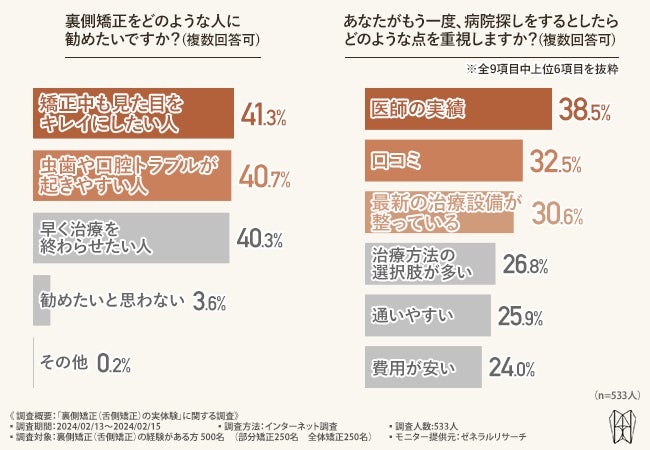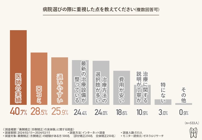 約6割が器具を目立たせないために裏側矯正を選ぶ、病院選びは医師の実績を重要視