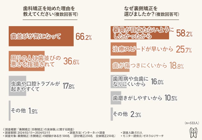 今回の調査で、約6割の方が器具が目立たないようにするために裏側矯正を選んだことから、歯科矯正中の見た目を気にする傾向が明らかになりました。