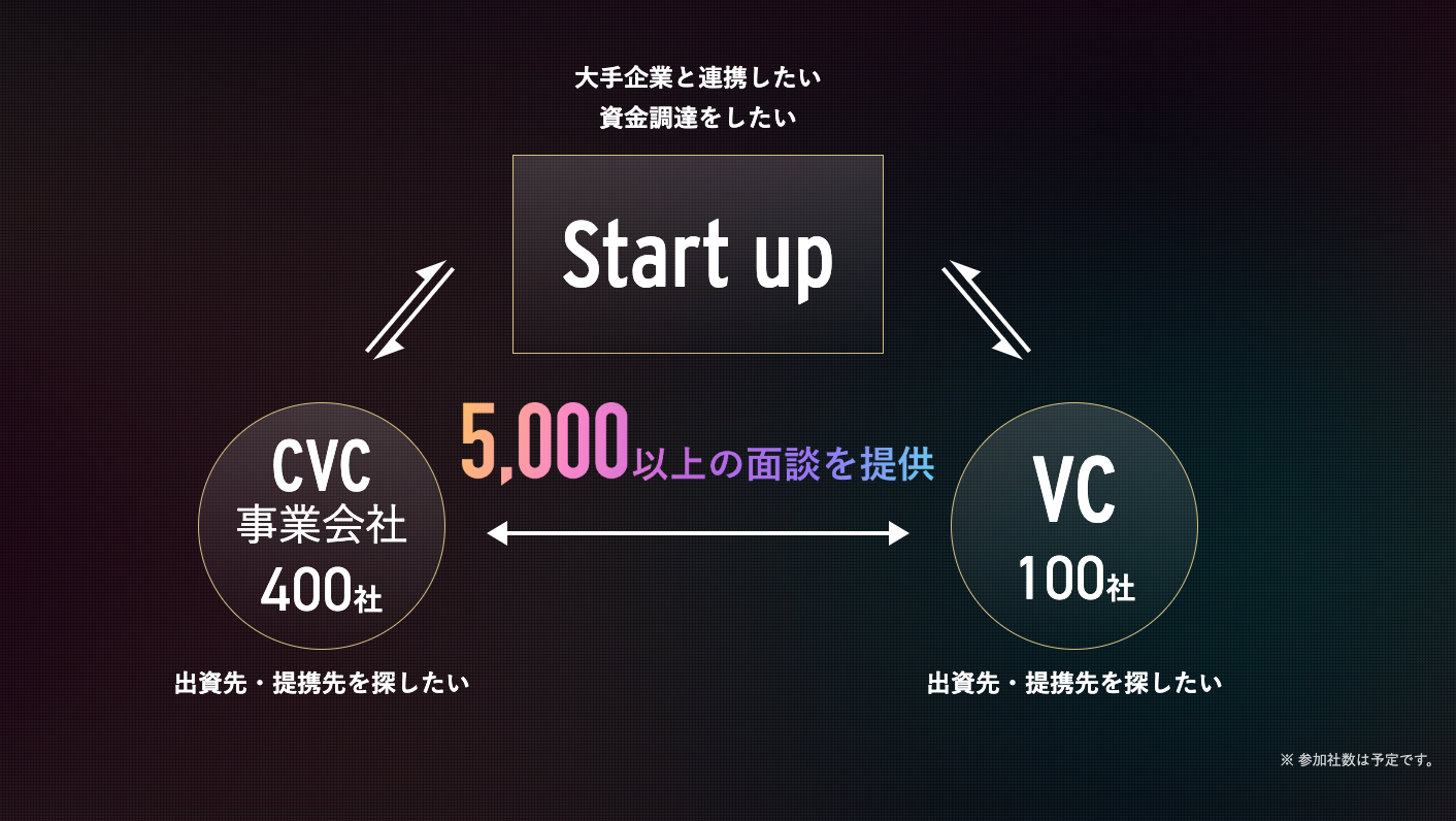 スタートアップにとって最適な資⾦調達環境を作るとともに、通常ではリーチしづらい⼤⼿事業会社との提携‧協業の面談オファーが出来る、スタートアップ経営を加速させる場を企画・実現します。