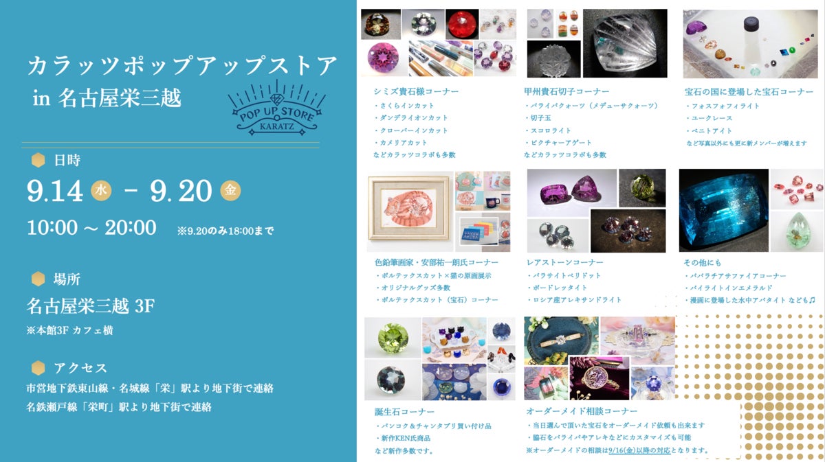 国内最大級の宝石専門情報メディア「KARATZ Gem Magazine」(カラッツジェムマガジン:https://karatz.jp/)を運営する株式会社カラッツ(本社:東京都台東区)は、9月14日(水)~20日(火)に名古屋栄三越(愛知県名古屋市)にて、東海地区初となるポップアップストア(期間限定ショップ)を開催することとなりました。