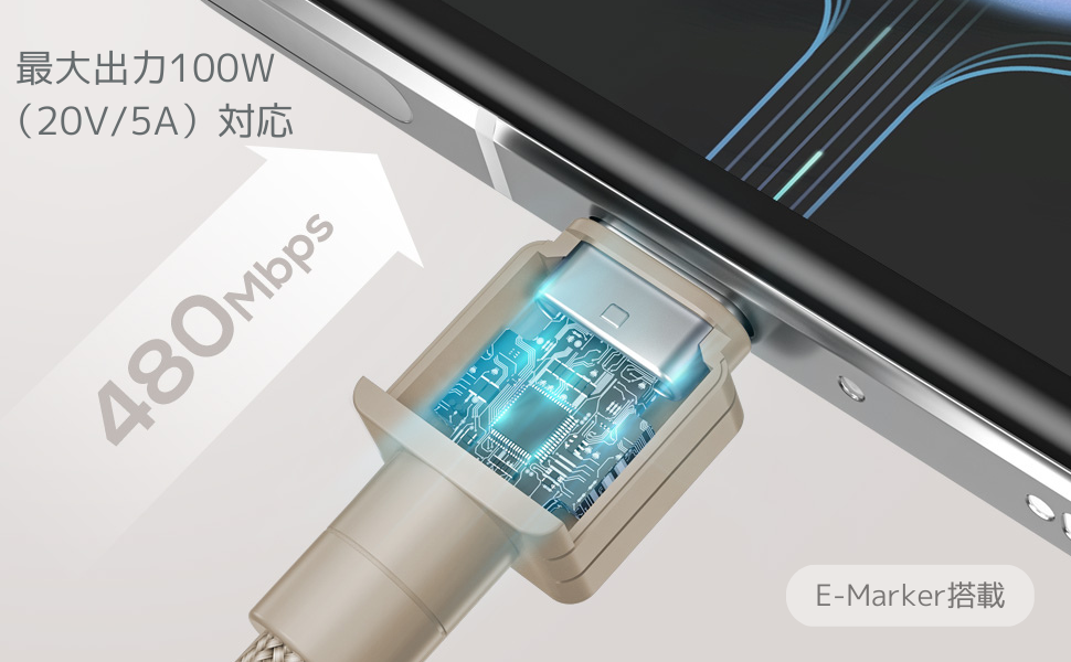 E-Marker(イーマーカー)搭載により、USB PD規格に合わせて最適な電力調整を行います。安心かつ安全に高速充電を行います。Androidのスマホやタブレット端末などの機器にご利用いただけます。