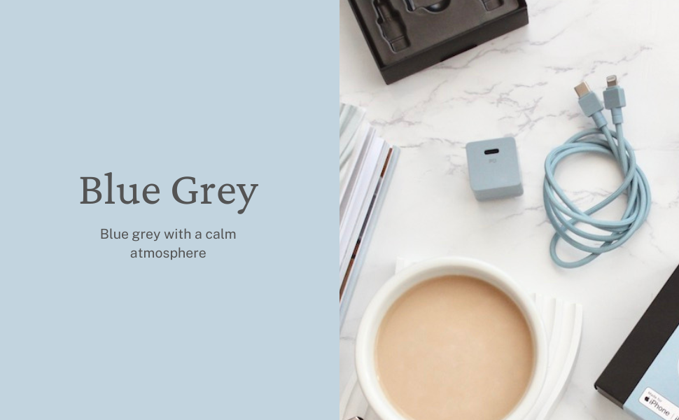 かわいいキューブ型のデザインと、グレージュ・ブルーグレーのカラーが相まって、小さいながらも存在感抜群のACアダプターは“自分らしさ”をさりげなく表現できるおしゃれなガジェットです。同色のUSBケーブル(Type-C to Cケーブル or ライトニングケーブル)も付属しています。