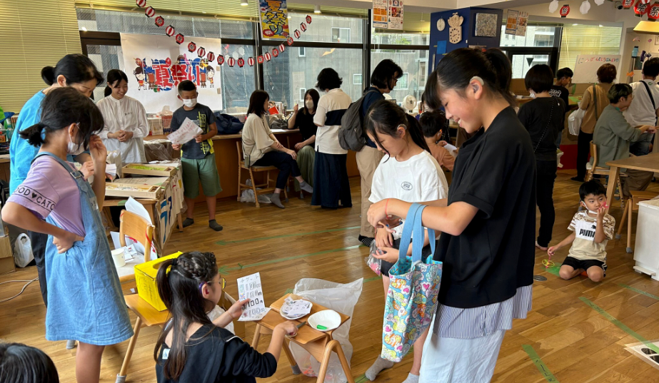 デフアカデミーに通うろう児・難聴児(小学生〜中学生)が主催して夏祭りを開催!チケットや装飾、かき氷屋さんや射的ゲームなどの催し物の数々、全て子どもたちが推進して手作りしました。夏祭り本番のこの日は、各地からの"お客様"を招き入れ子どもたちが接客をして交流します。