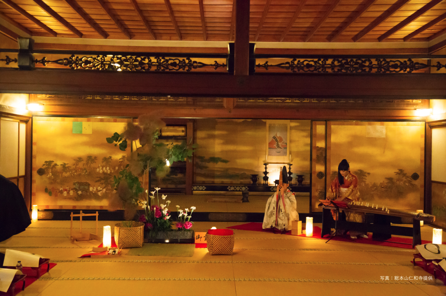 内容:世界遺産 仁和寺を貸切っての文化体験(特別法要・護摩祈願・ライトアップ拝観等)メゼババ髙山大による特別ディナーコース、雅楽鑑賞 他