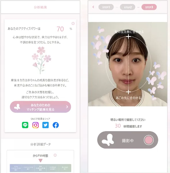 産後の女性の生活や、乳幼児を育てていく育児環境をより向上させるため、心とからだの状態を顔写真から分析する「独自の分析技術」を搭載。産後ママの"今"の状態にあったケア・サービスをマッチングするアプリです。