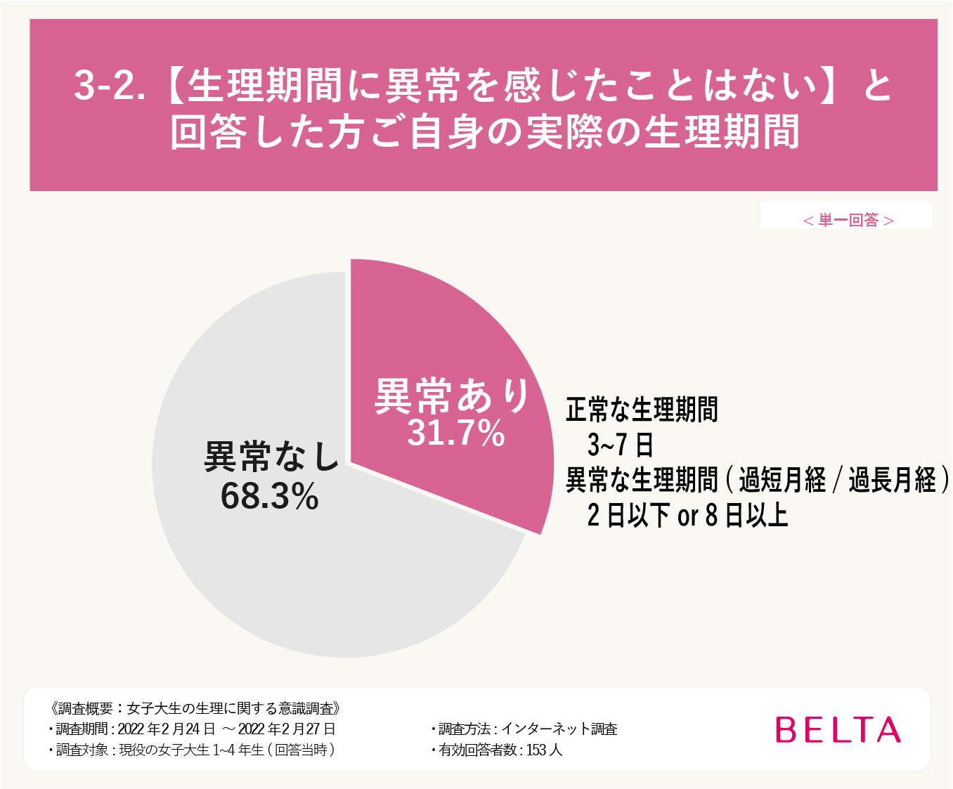 3- 2 「自身の生理期間に異常を感じたことはない or 気にしたことがない」と回答した人のうち、31.7%が自身の生理期間の異常に気づいていない