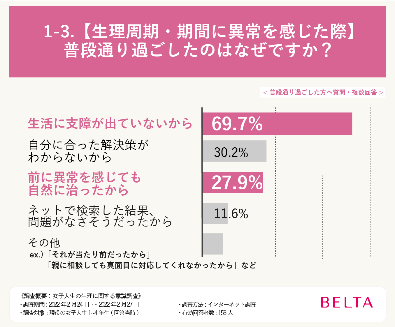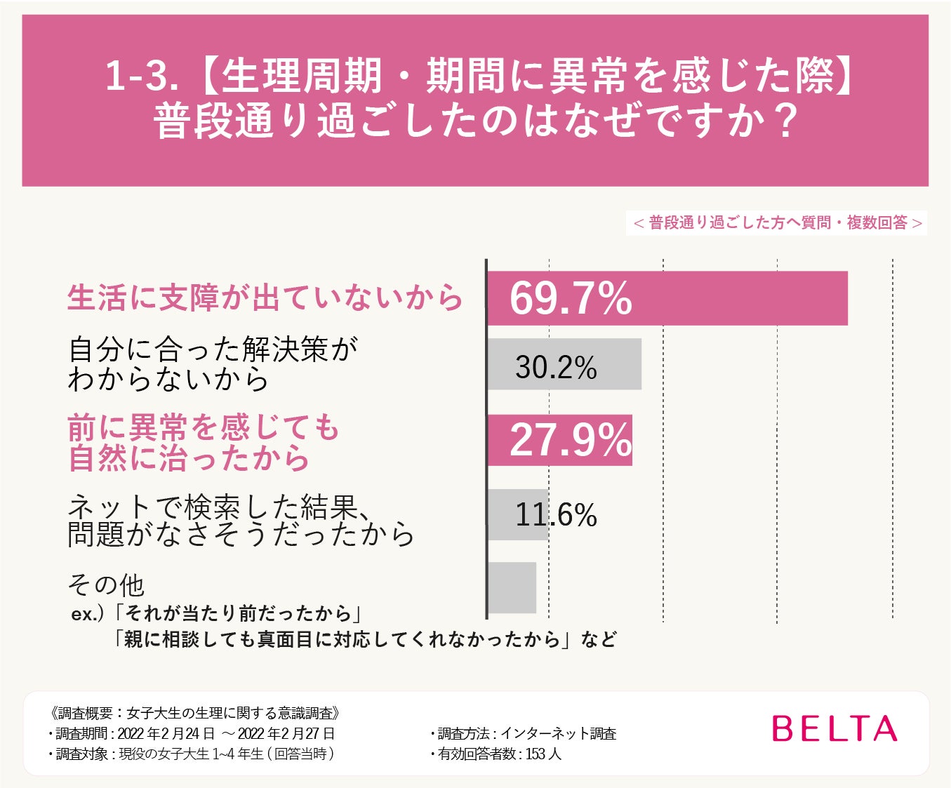 また、「普段通り過ごした」理由で多く見られたのは、「生活に支障がないから:30人(69.7%)」や「前に異常を感じても、自然に治ったから:12人(27.9%)」(1‐3)。このことから多くの女子大生が生理周期や期間の異常をそもそも問題視していない可能性が高いことがわかりました。