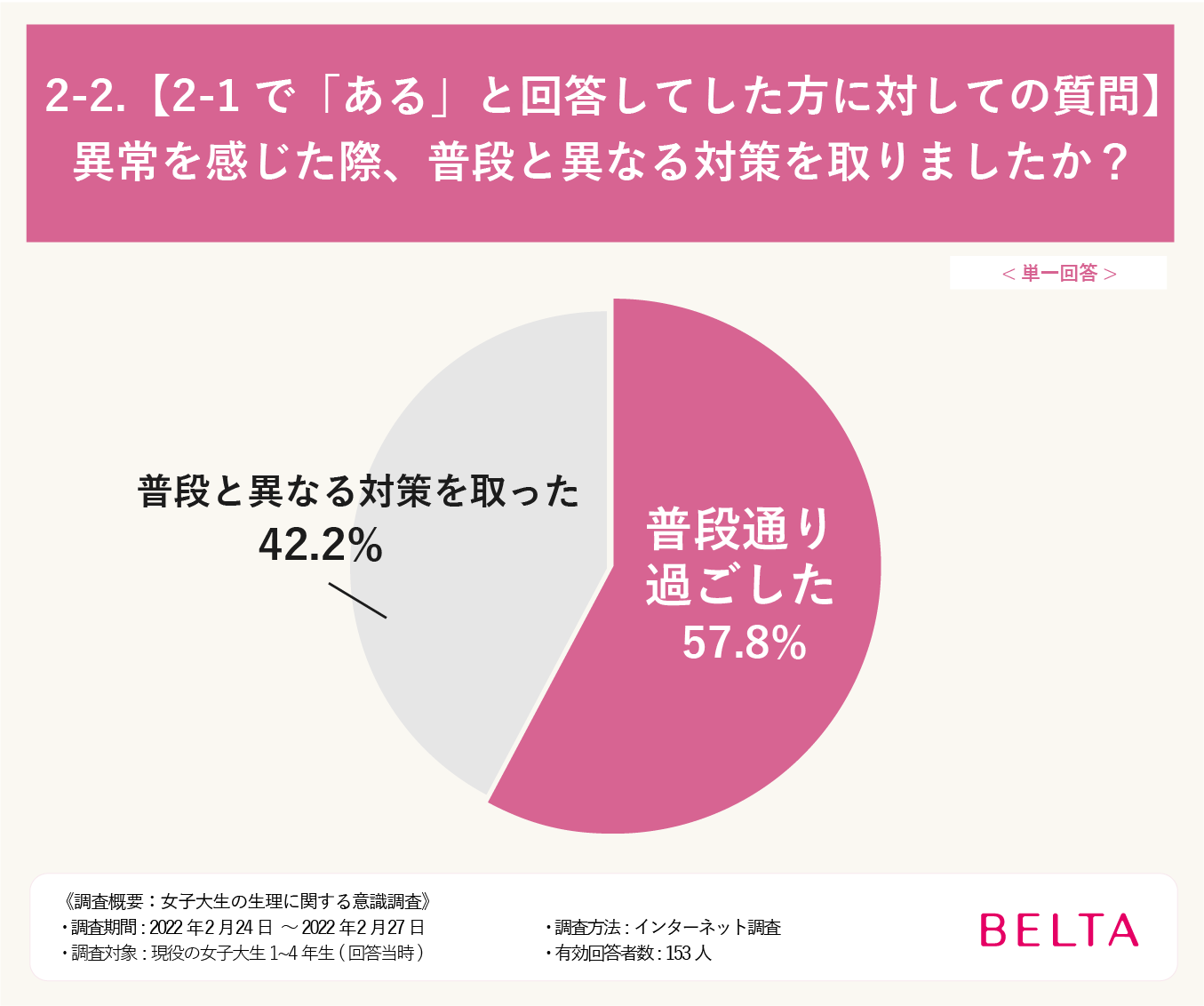 2. 「経血の量について」57.8%の女子大生が異常を感じても「普段通り過ごし、特に対策はしていない」と回答