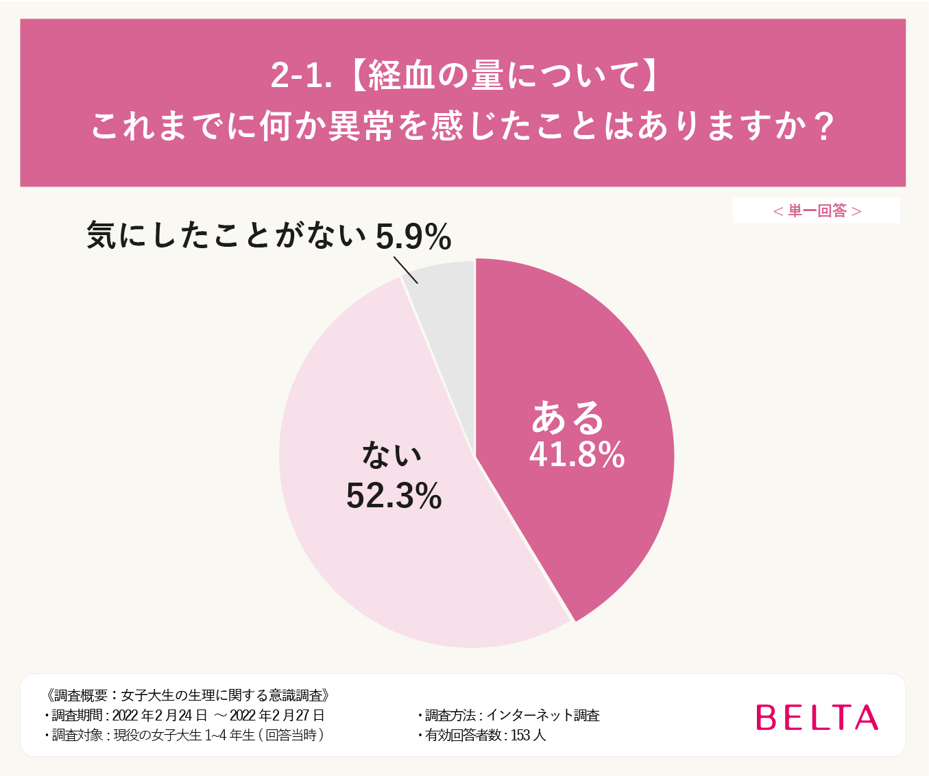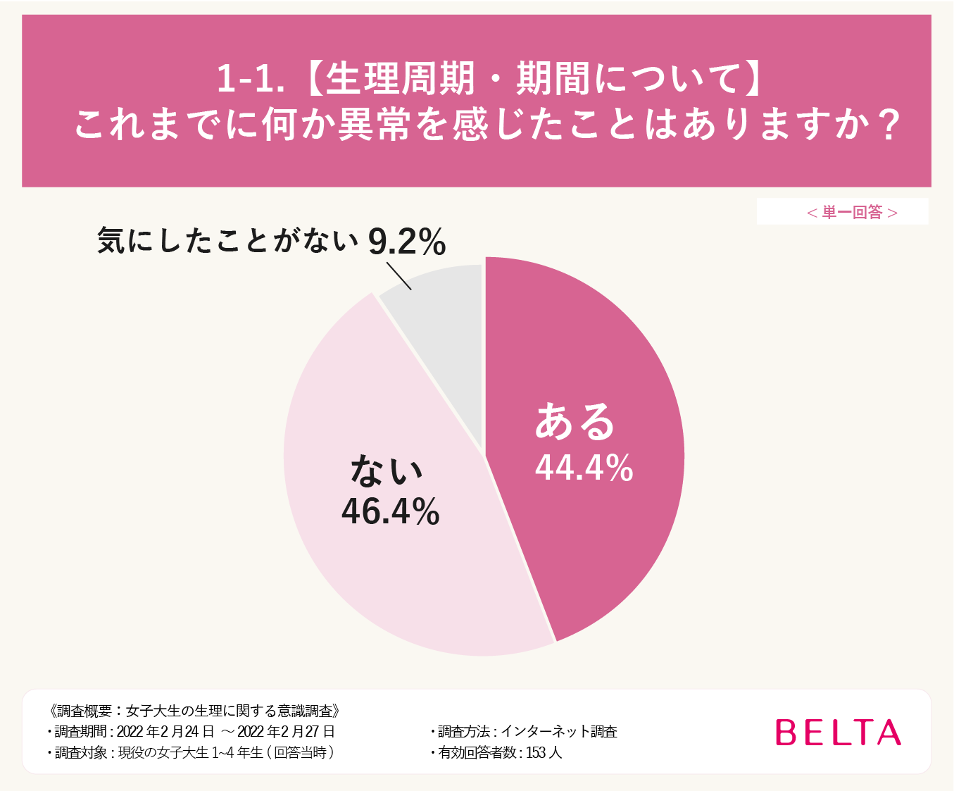 株式会社ベルタ(本社:東京都港区、代表取締役社長:武川克己)が運営する女性のライフステージブランドBELTAは、女子学生の声なき声や悩みに耳を傾け、社会に発信していく学生団体megaphONEと153名の現役女子大学生(回答回収当時)を対象に「生理に関するアンケート」を共同実施いたしました。
