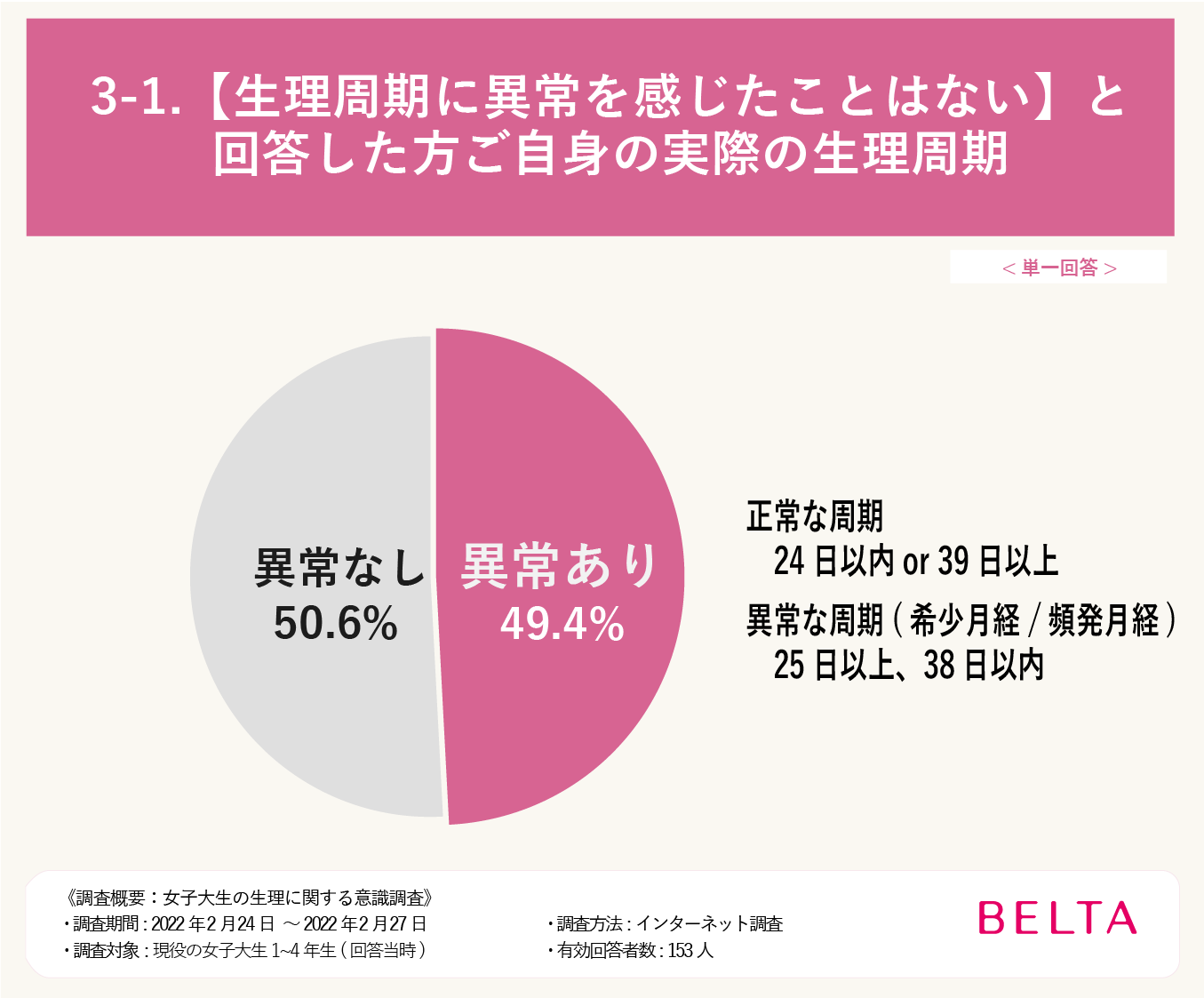 3- 1 「自身の生理周期に異常を感じたことはない or 気にしたことがない」と回答した人のうち、49.4%が自身の生理周期の異常に気づいていない