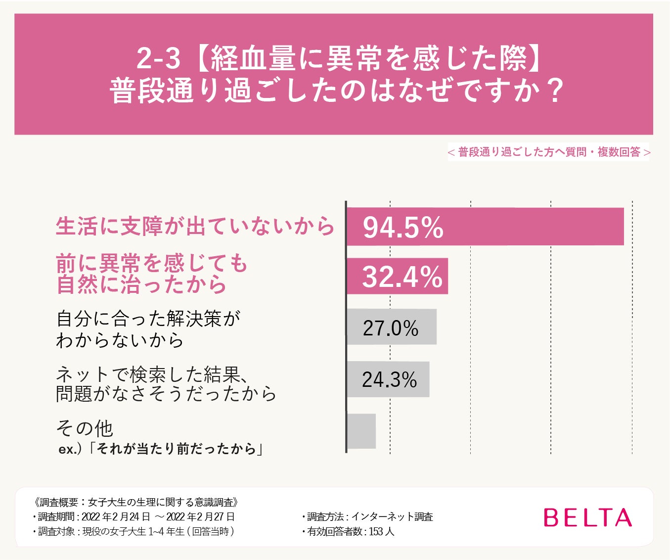 また、「普段通り過ごした理由」で多く見られたのは、「生活に支障が出ていないから:35人(94.5%)」や「前に異常を感じても、自然に治ったから:12人(32.4%)」(2‐3)。以上のことから多くの女子大生が経血量の異常についても問題視していない可能性が高いことがわかりました。