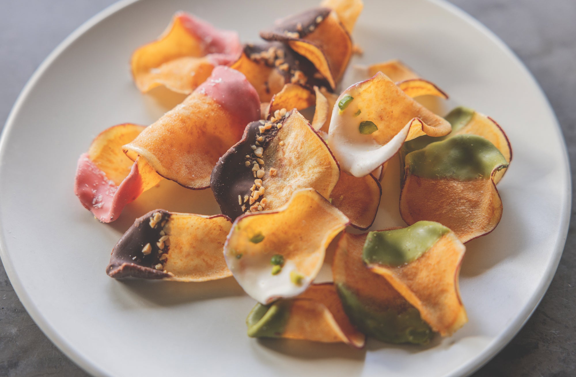 パリッと揚げたさつまいもチップスには溢れ出る蜜の甘さが特徴的な《SAZANKA》の蜜芋「べにはるか」を使用。さつまいもの自然な甘みを引き出す宮崎県産の「満潮の塩」、色鮮やかな最高級チョコレート「ヴァローナ」と、それぞれのチョコレートに合う素材を厳選しトッピングした、見た目にも可愛く華やかで彩り豊かな蜜芋スイーツです。