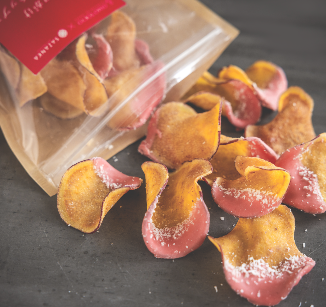 甘酸っぱく華やかな香りのストロベリーチョコレートに、トロピカルなココナッツの風味とサクサクとした食感がアクセントになった、見た目もキュートなさつまいもチップスです。