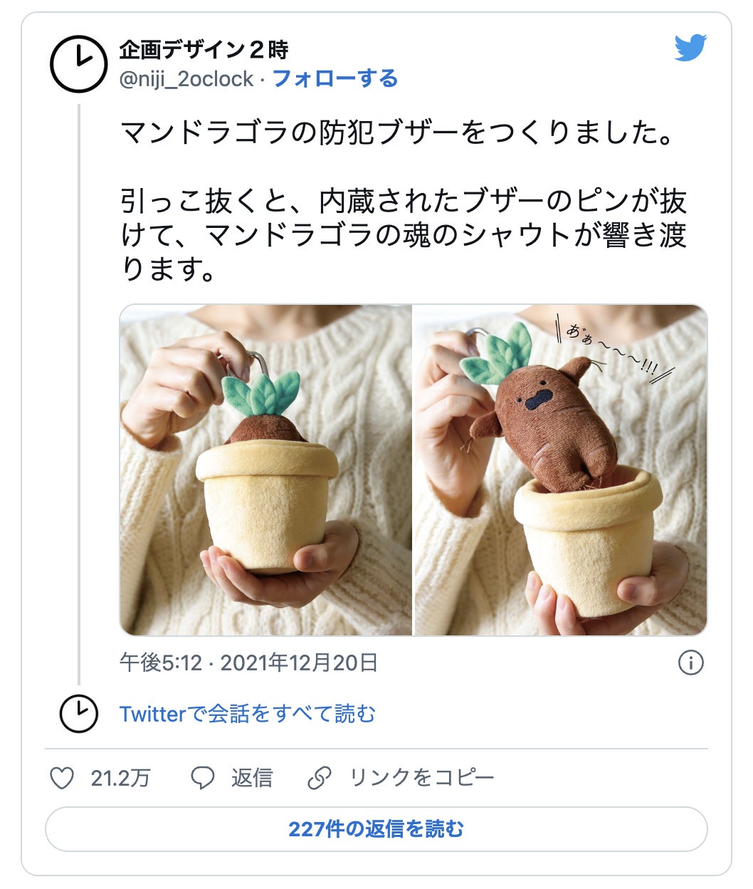 ユニークな商品企画を専門に行う会社「株式会社2時」がツイッターで試作品を投稿し、話題を呼んだ「マンドラゴラが叫ぶ!?ひっこぬきマスコット」の先行予約受注が6月27日より開始します。マンドラゴラを土からひっこぬくと叫び声を上げるという伝説がもとになった商品で、マスコットを鉢から引き抜くと内蔵されたブザーのピンが抜けて、マンドラゴラの魂のシャウトが響き渡ります。音はぴぃぃぃぃ〜〜〜という耳を塞ぎたくなるようなブザー音です。手のひらにすっぽり収まるサイズ感で、カラビナ付きなのでバッグにつけて持ち歩けます。お守りがわりの相棒として、いろんなところに連れ歩いてあげてください。