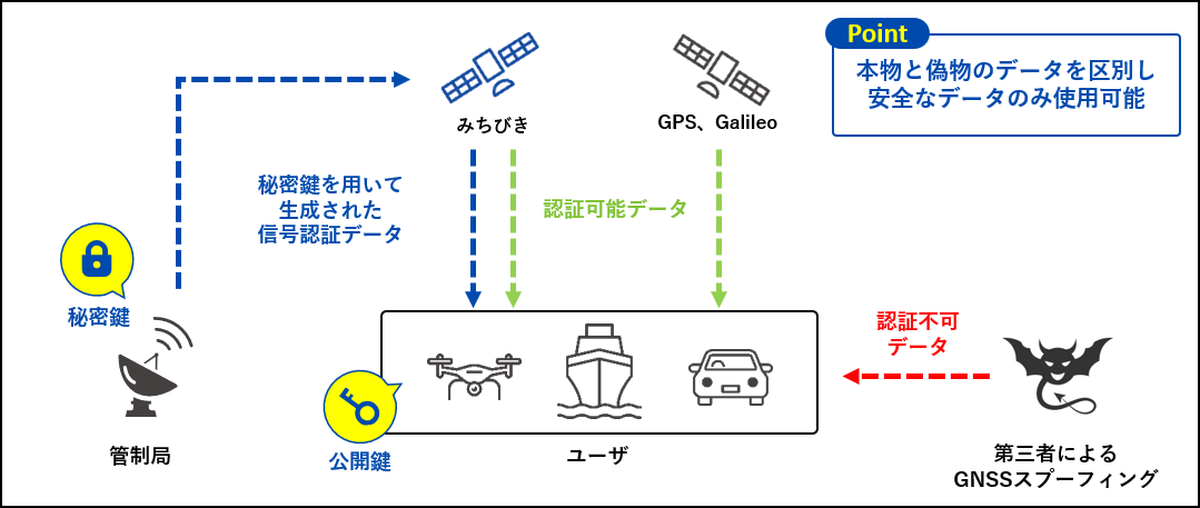 GNSSスプーフィング対策として、みちびきでは2024年度に信号認証サービス(以下、本サービス)の導入を予定しています。みちびきから配信される電子署名情報と受信機が予め保有する公開鍵を利用し、衛星からの正常な信号かどうかを判別することで、妨害信号を遮断します。みちびきは日本独自の衛星であるため、他国に依存することなくGNSS信号のセキュリティを担保できます。