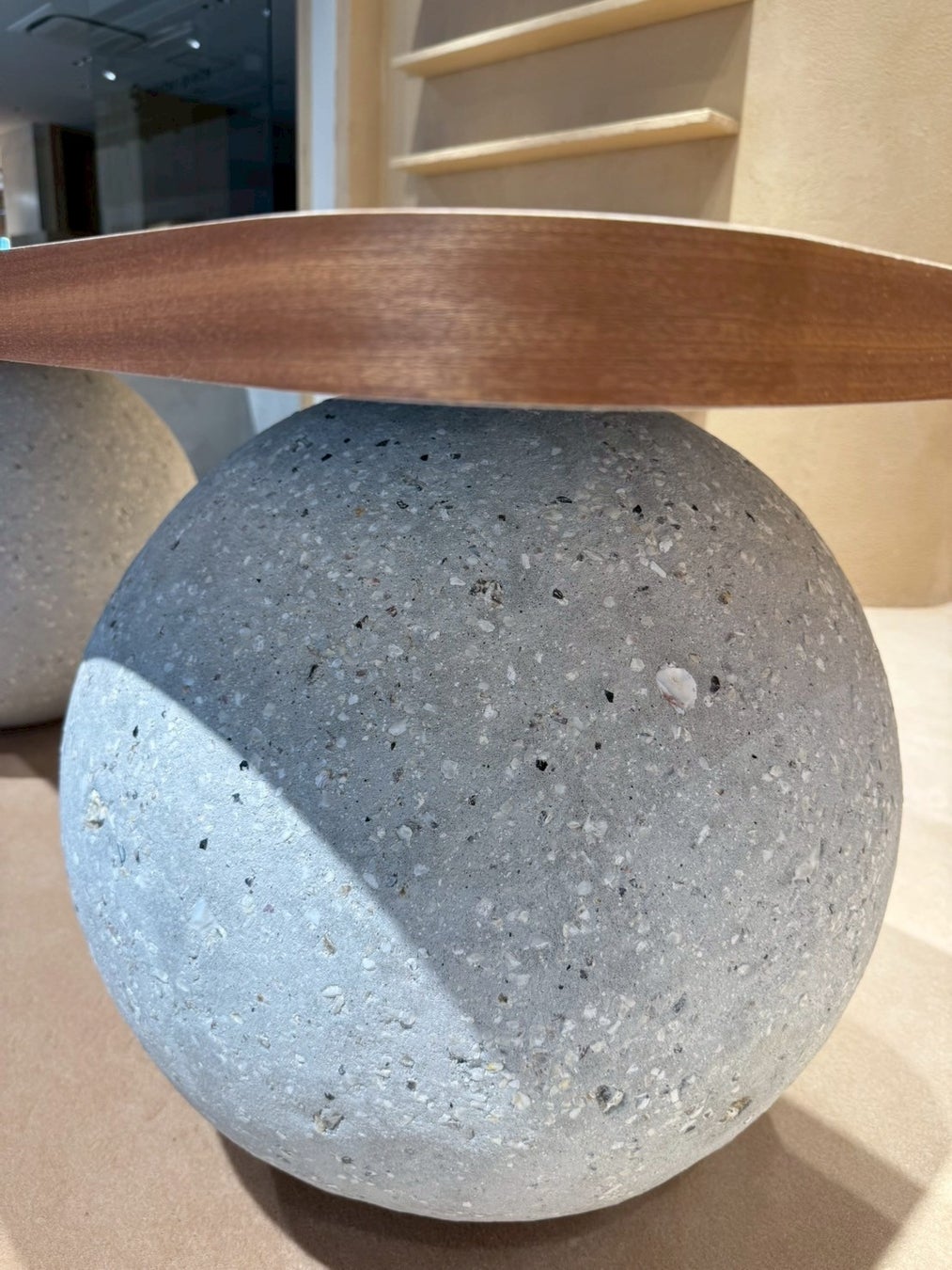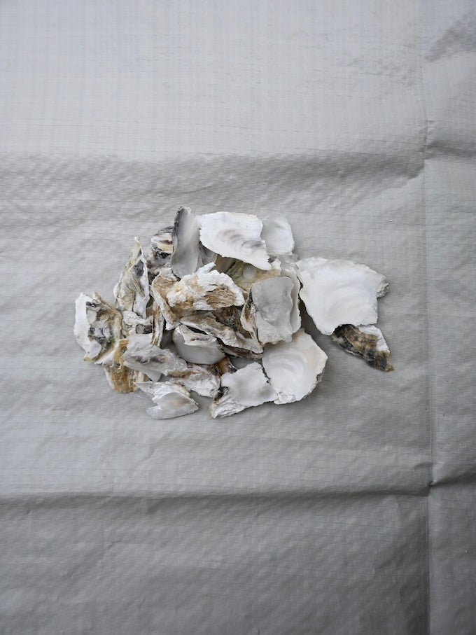 自然の恵みを感じる店内にという思いから、福岡・糸島の牡蠣屋「かきのますだ」から、『美味しくいただいた後に出る牡蠣の殻』を活用し、福岡産素材を使ったアップサイクル什器として店内に採用しています。今回は店内什器の脚元と壁面の左官材料として起用。廃棄される素材に新たな価値を生み出し、環境に配慮した素材を用いて、店舗空間をエシカルな素材で構築することを実現しています。