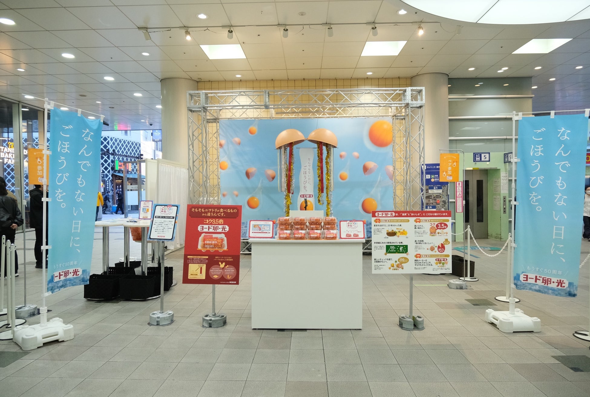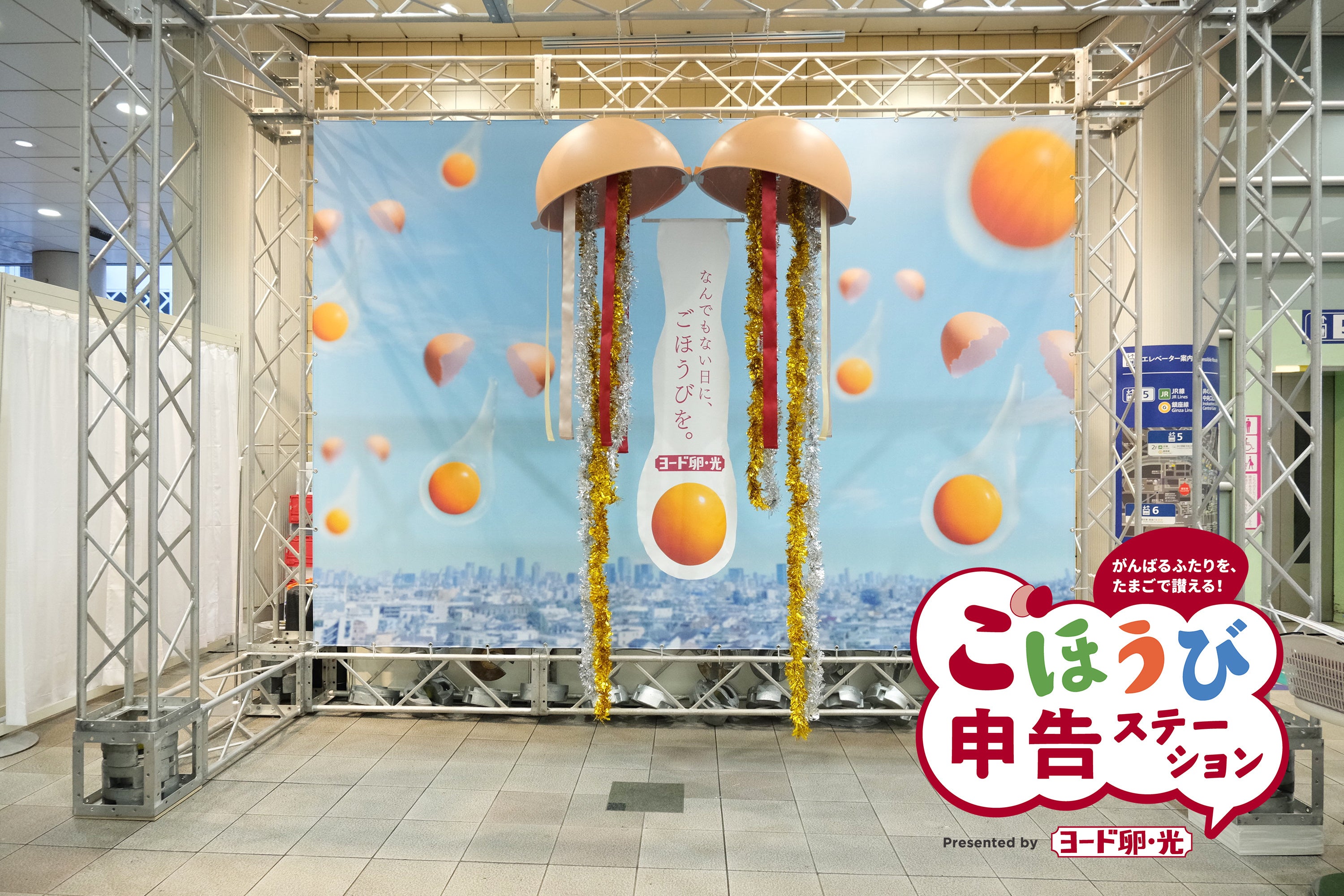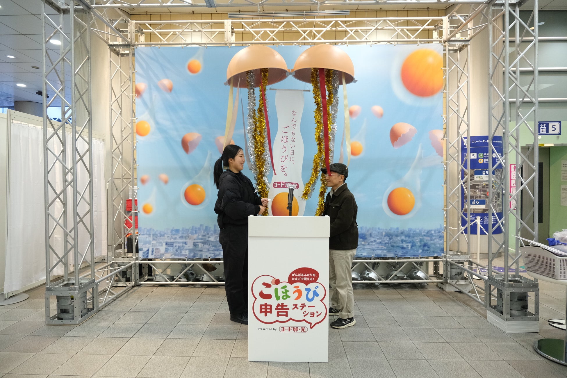 会場では、巨大なたまご型くす玉を割るイベント体験のほか、 “コク3.5倍※”の『ヨード卵・光』を“ごほうびたまご”としてプレゼント。 言葉のごほうびを贈り合うふたりを讃えながら、これまで言葉にできなかったコミュニケーションを育む場を創出します。