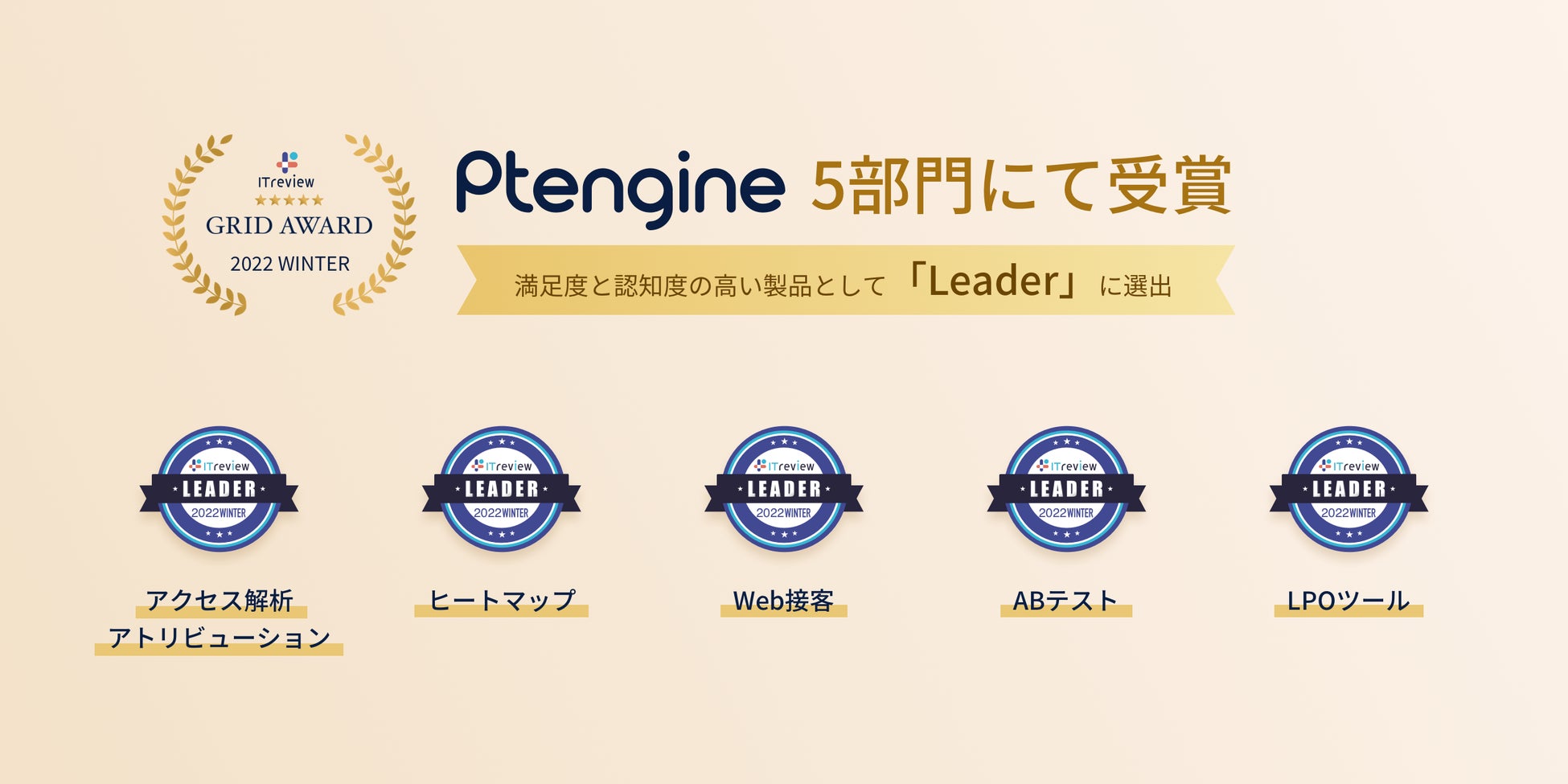 データの価値を最大化する株式会社Ptmindは、当社が提供するサイト運営プラットフォーム「Ptengine(ピーティーエンジン)」が、アイティクラウド株式会社主催「ITreview Grid Award 2022 Winter」において、「アクセス解析・アトリビューション」、「ヒートマップ」、「Web接客」、「ABテスト」、「LPOツール」の5部門にて、「Leader」に選ばれたことをお知らせします。