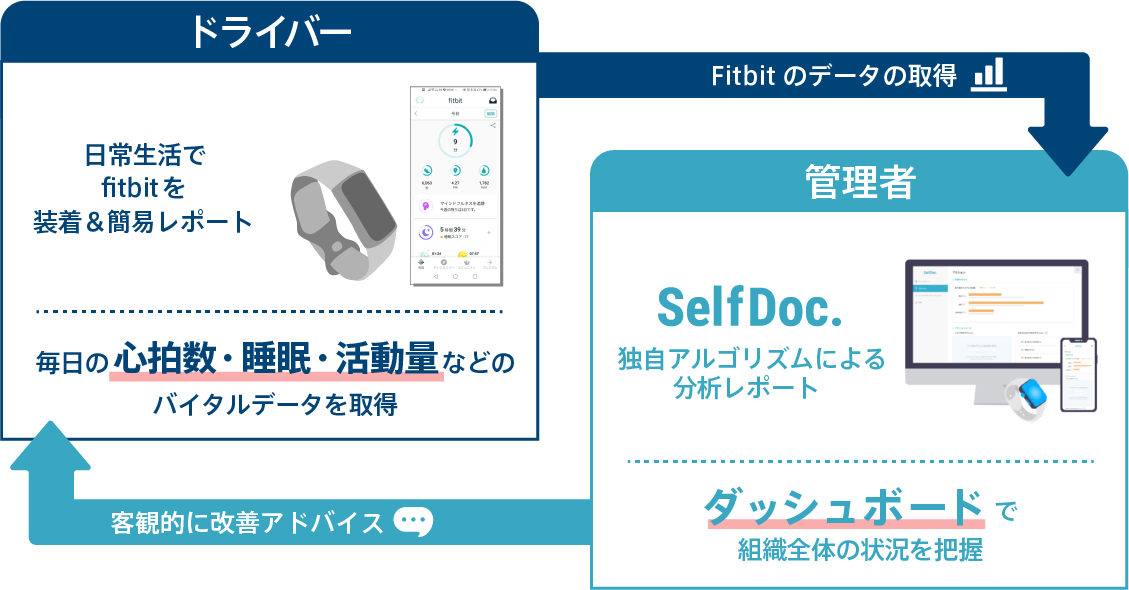 本取り組みでは、ウェアラブルデバイスで取得できるデータを独自のアルゴリズムを使って分析し、ドライバーの健康状態を分かりやすいレポートとして提供いたします。それらを通して、ドライバーの健康意識や行動変容、実際の事故リスクにどのような影響をもたらすかを検証してまいります。