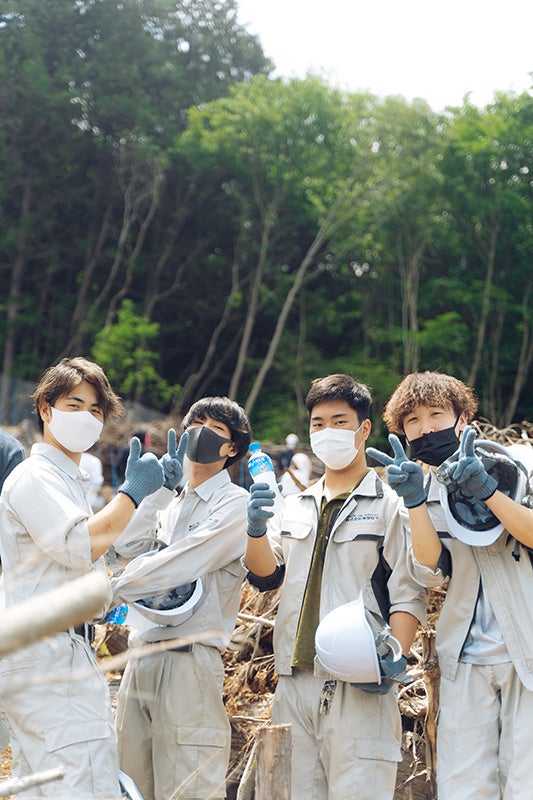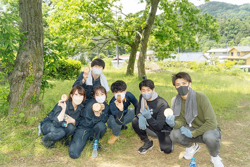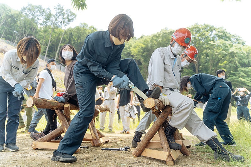 植樹を終えた参加者は、簡単そうに⾒えて難しい丸太切り体験にもチャレンジ。まっすぐ丁度良い厚さに切るのは難易度が⾼い丸太切りに苦戦しながらも、普段では⾒られない笑顔が溢れていました。