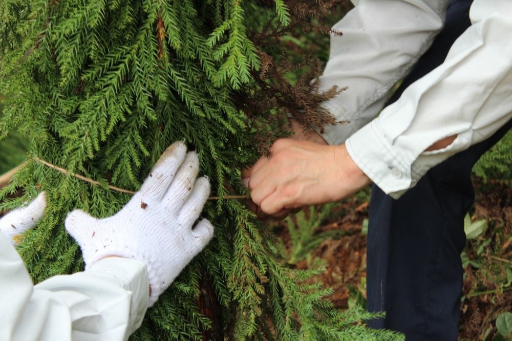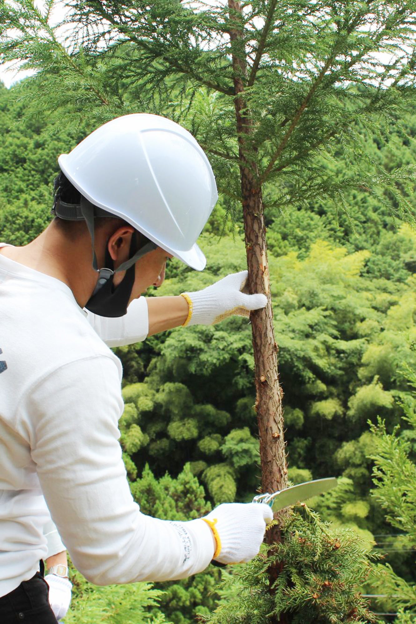 枝の量を調整して⽊々の重なりを減らし光環境の改善をすることで幹(みき)の成⻑を促すための枝打ち作業は、節(ふし)のない良質な木材生産にもつながります。切り落とした枝は幹に括り付け⿅被害の対策も⾏いました。現場監督や技能職の社員は持ち前の器⽤さを活かして、次から次へと綺麗に仕上げていました。