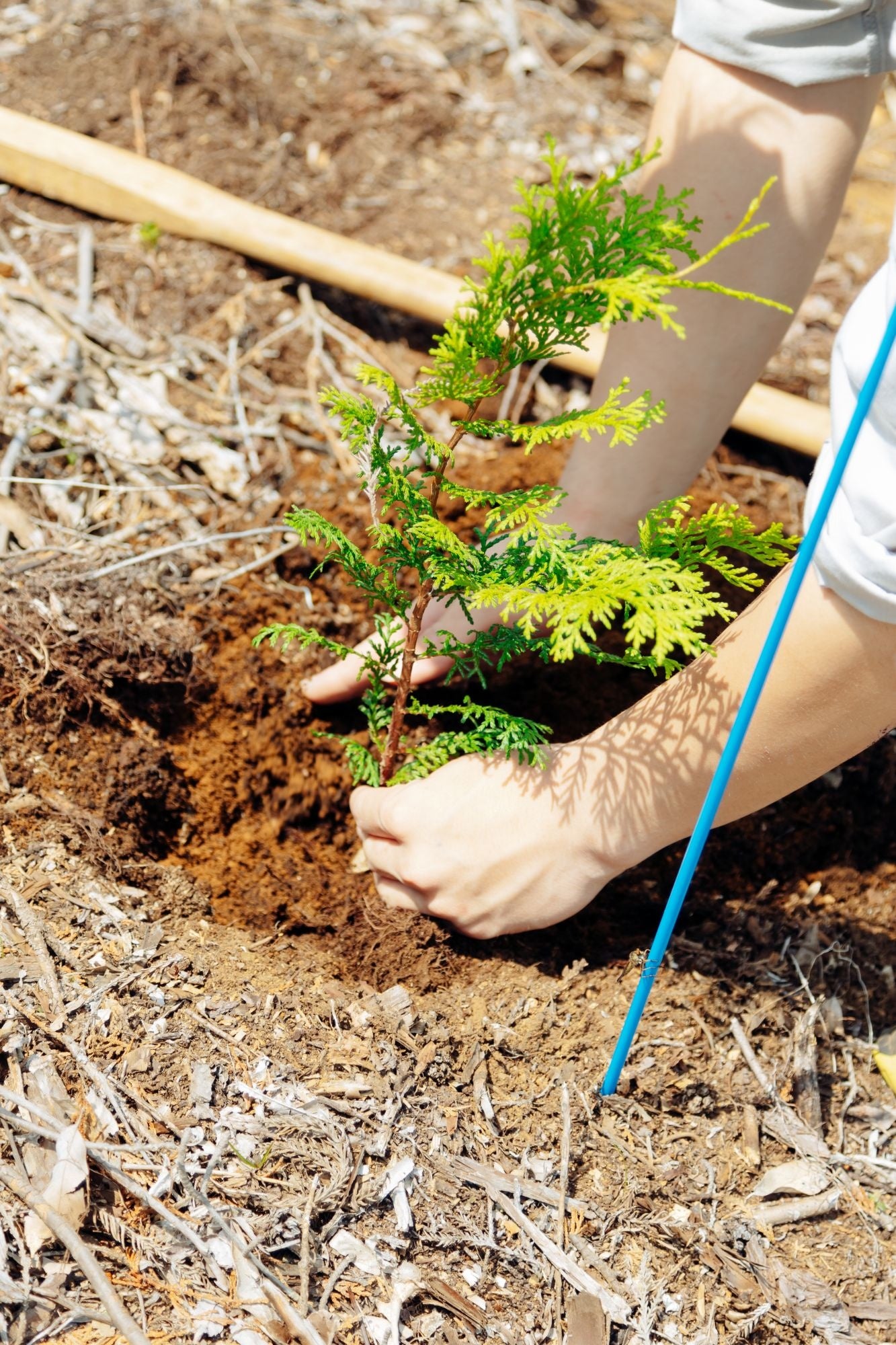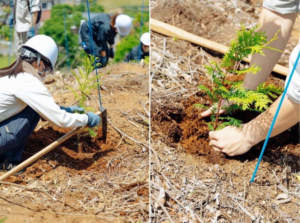 5⽉のイベントは2022年2⽉に新たに協定を締結した3か所⽬の森「企業の森・東栄住宅(⻘梅富岡)」で花粉の少ないスギやヒノキの苗を植える 植樹作業を実施!総勢42名の社員が植樹イベントに参加しました。