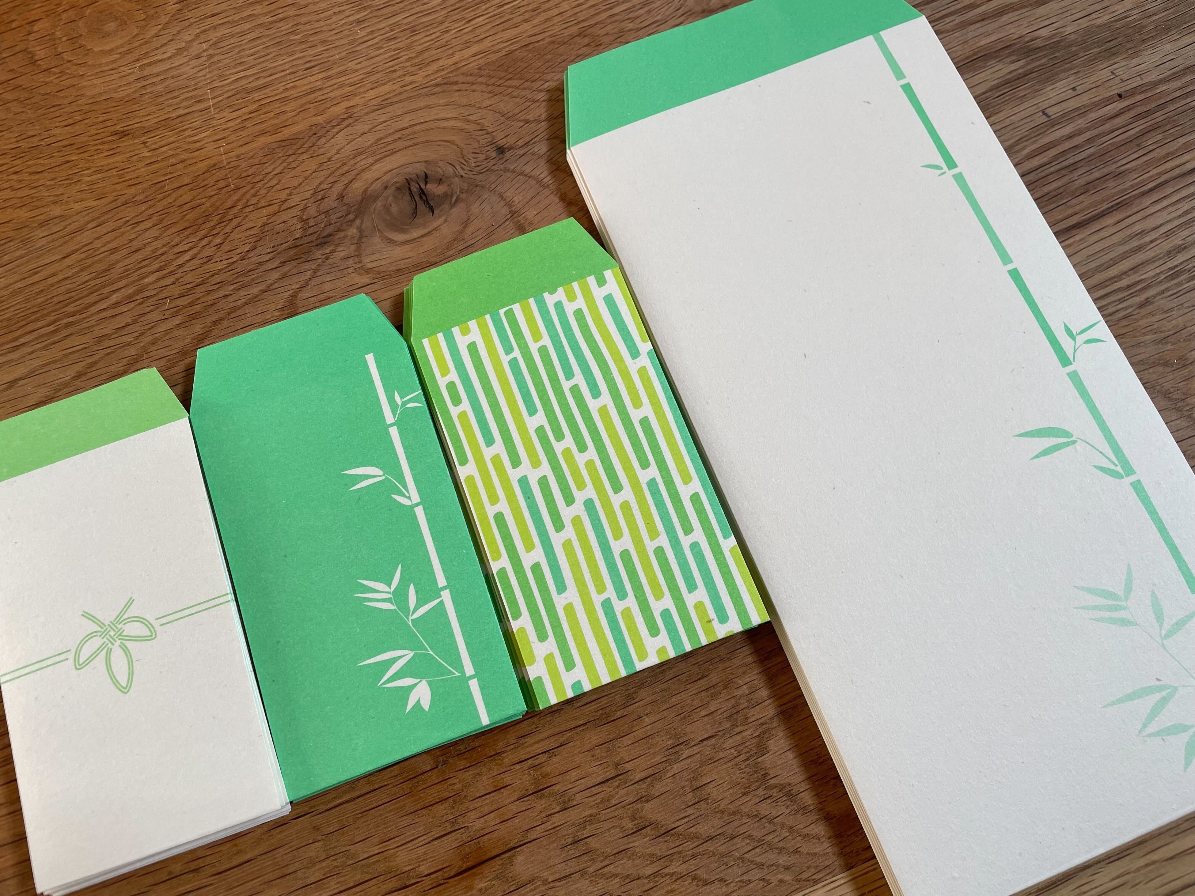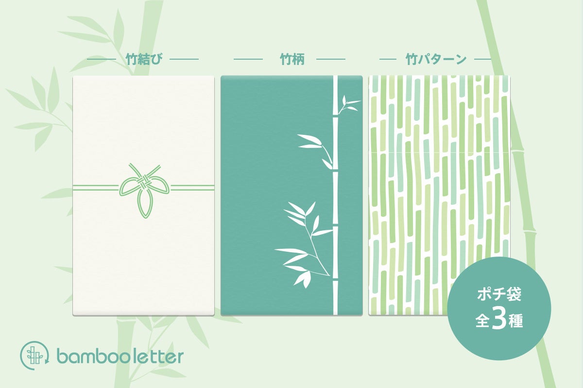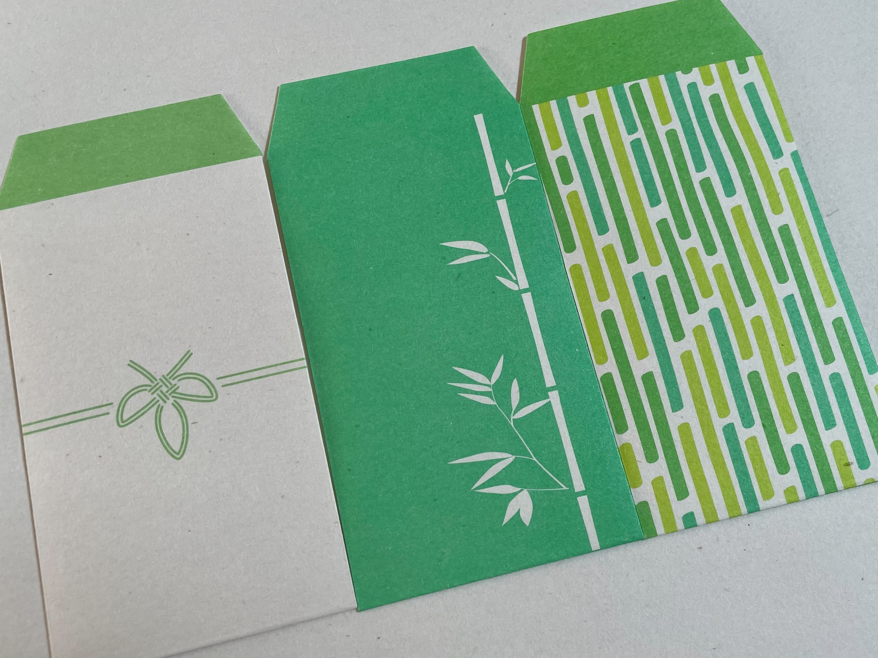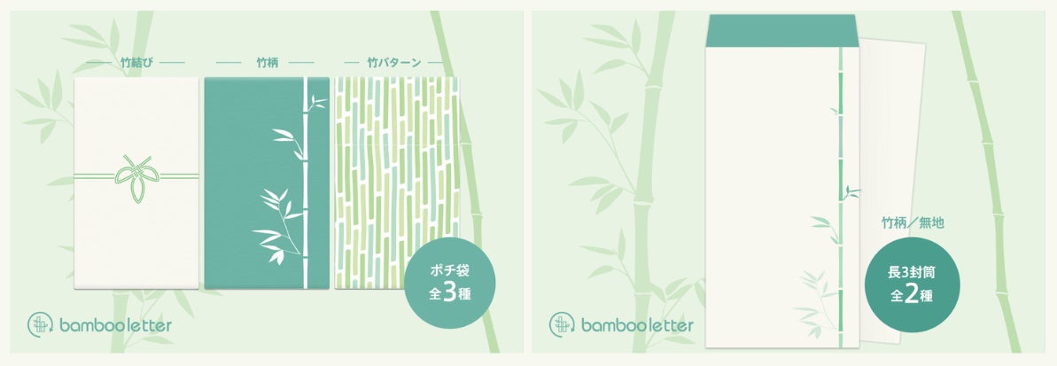 封筒は長3(定型)のサイズで「竹柄」と「無地」の2種類、ポチ袋は「竹結び」「竹柄」「竹パターン」の3種類をつくります。
