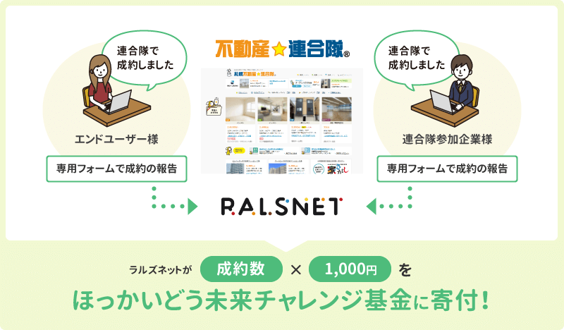 2024年5月1日~2023年6月30日の期間中、『不動産連合隊』において、「全国のご成約数×1,000円※」を、弊社より『ほっかいどう未来チャレンジ基金』に寄付いたします。