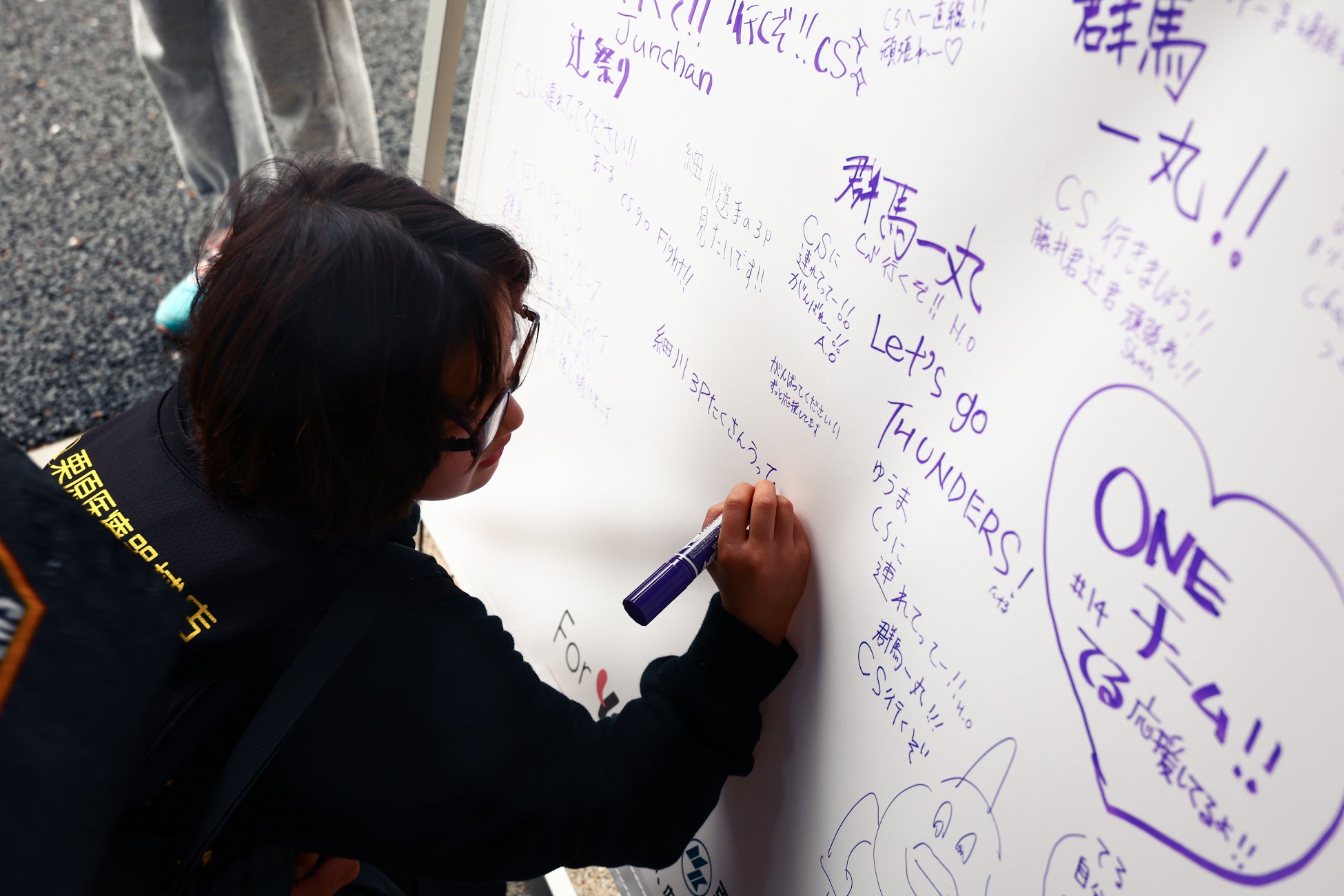 ブース内に設置した大型ボードに、選手を“言葉で背中を押す”機会として応援メッセージをご記入いただきました。寄せ書きは後日チームにお届けする予定です。