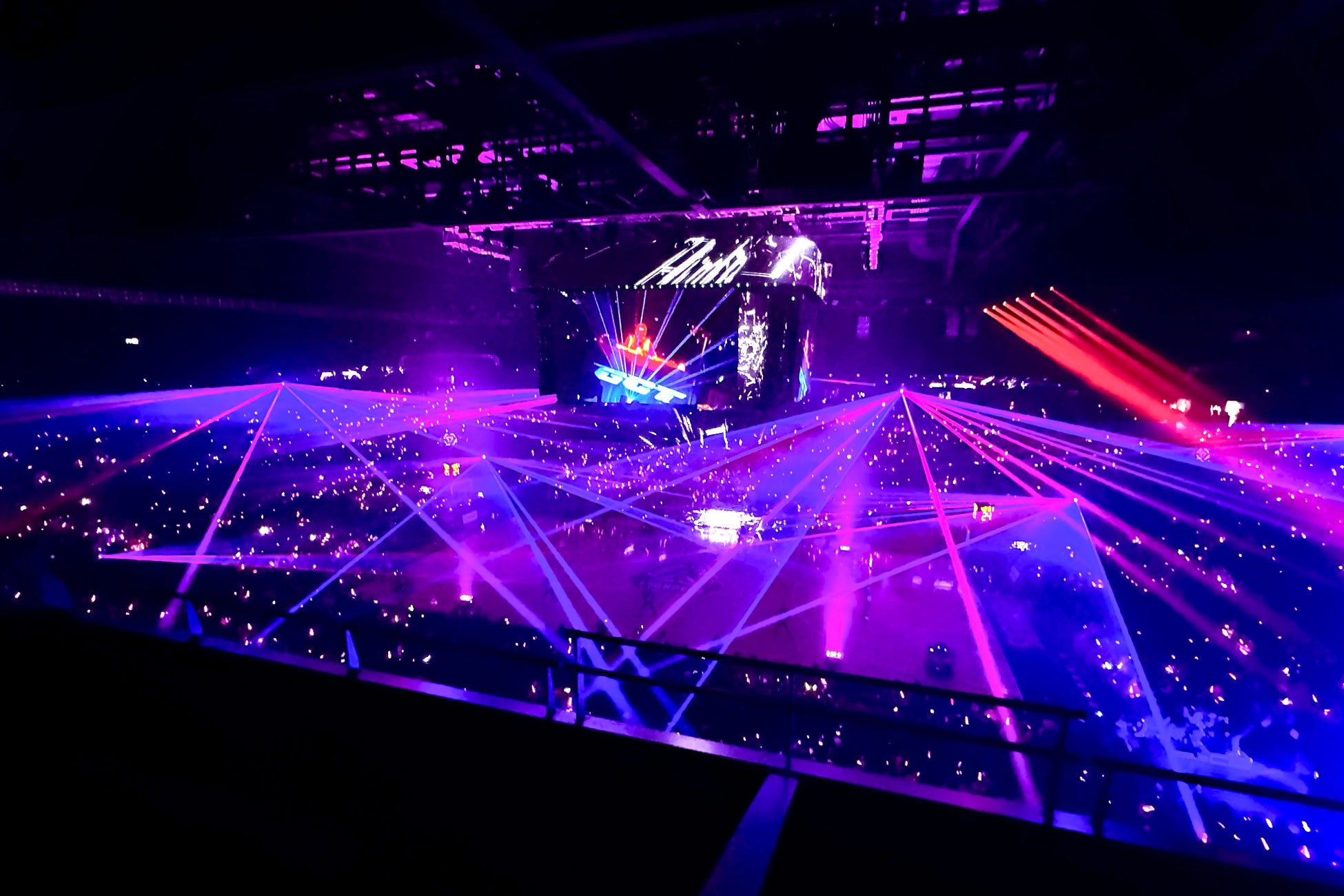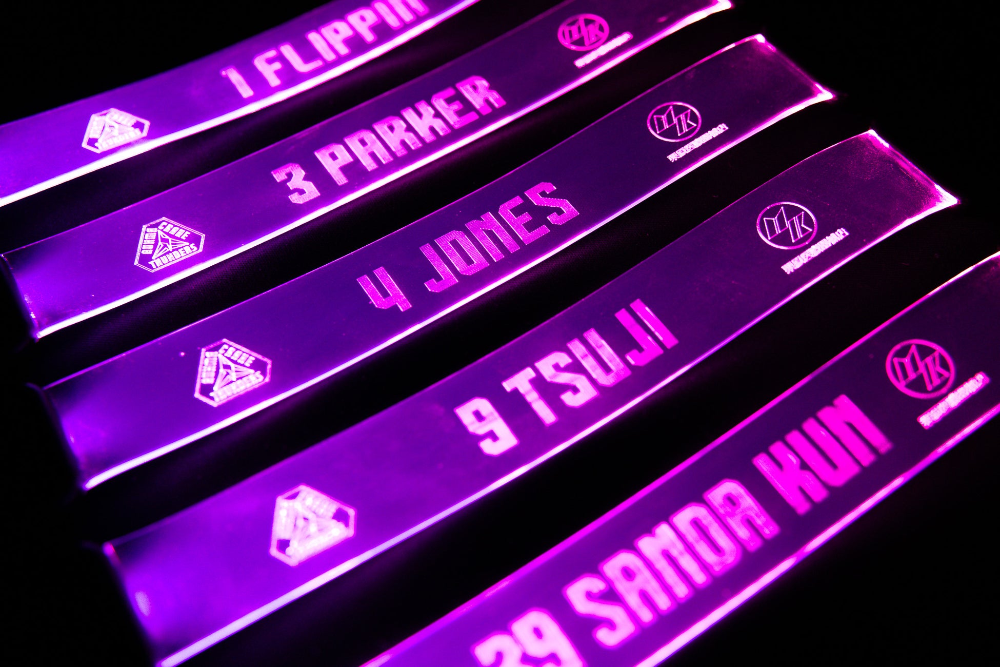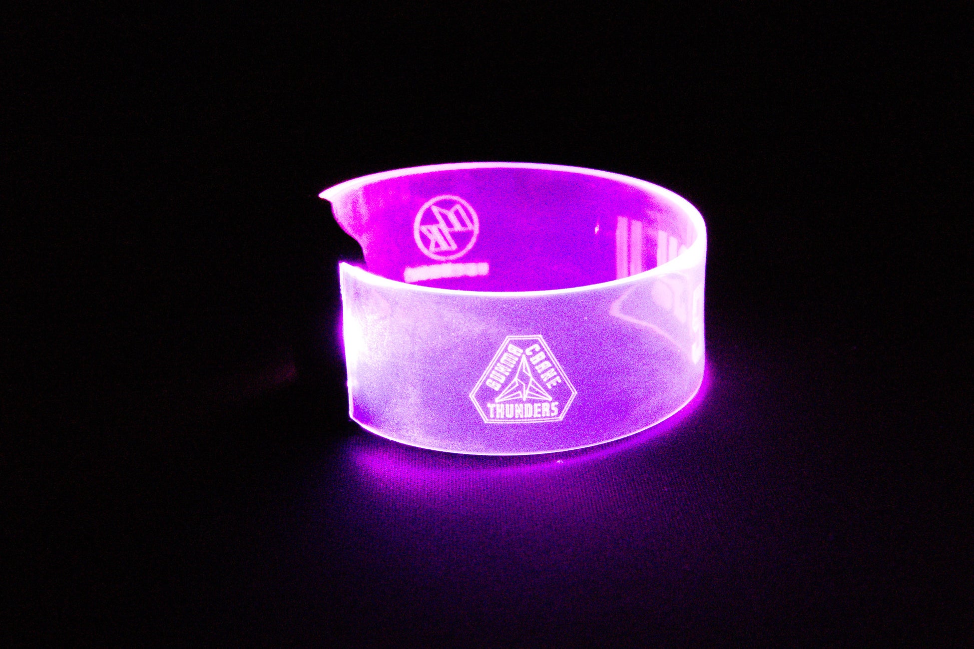 この趣旨に賛同した当社では、来場者先着5,000名にLEDブレスレットとチームロゴ入りのコラボマスクを配布。13種類のLEDブレスレットが“紫の光“を放ち、会場であるオープンハウスアリーナ太田を幻想的な空間に包み込みました。