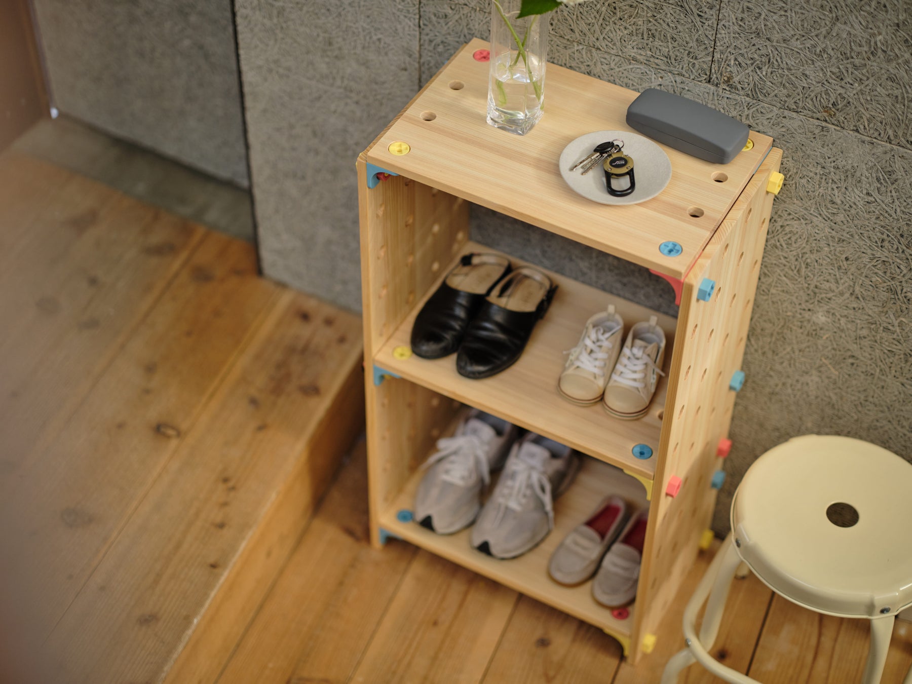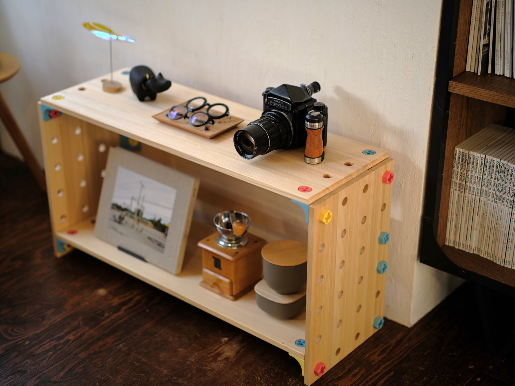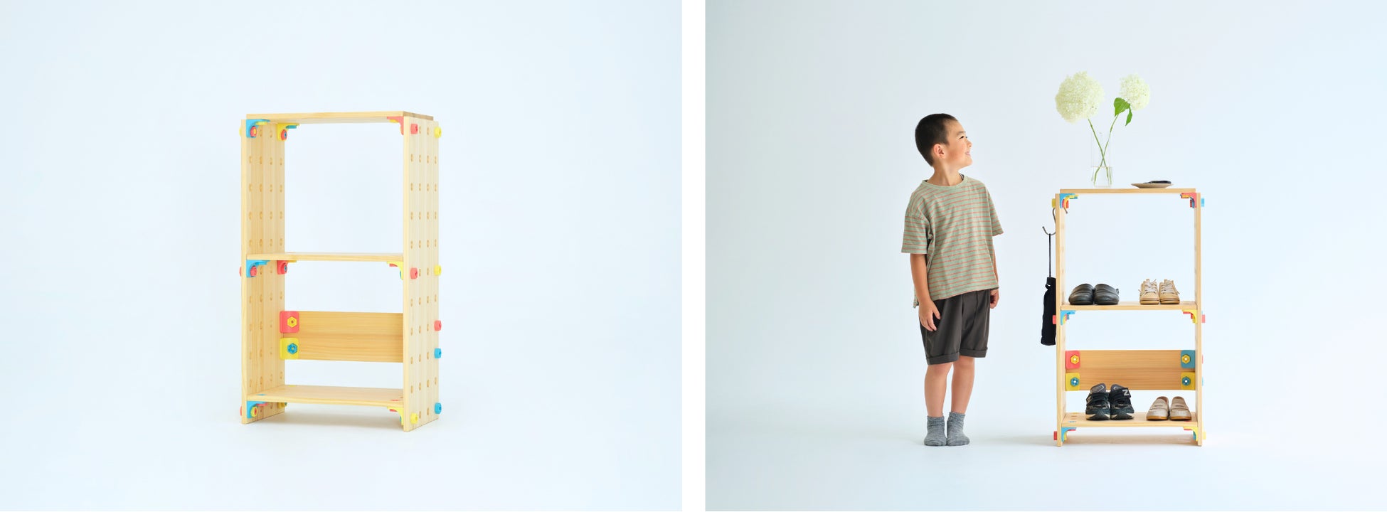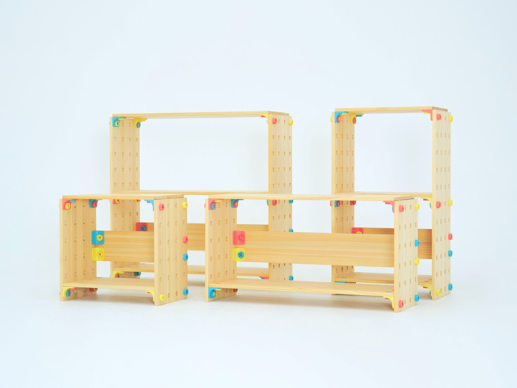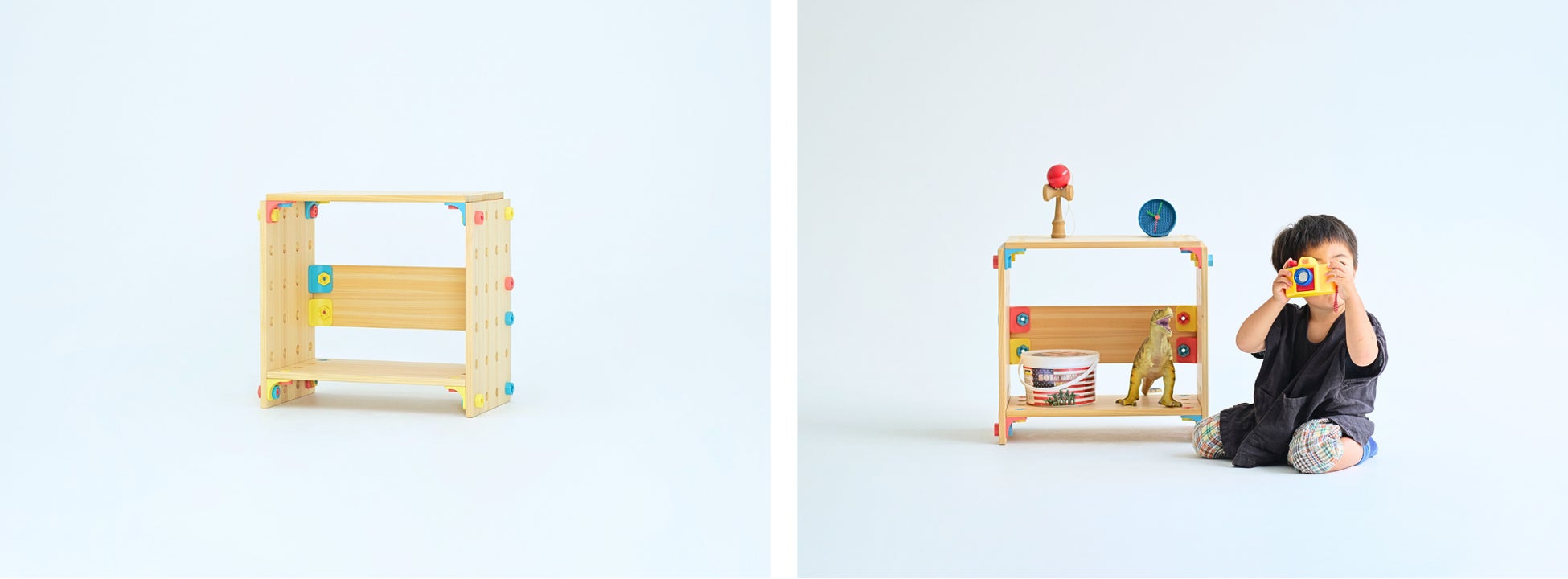 FABLOCKは「分解しやすい」という点にもこだわり、ひとつの形を作って終わりではなく、思いついた時に作り変えることができるのも大きなポイントです。パーツを組み替えることで、収納棚やテーブルなど、ものづくりの幅が広がります。お子さまの成長と共にかたちを変えていけるため、愛着をもって長くご使用いただけます。