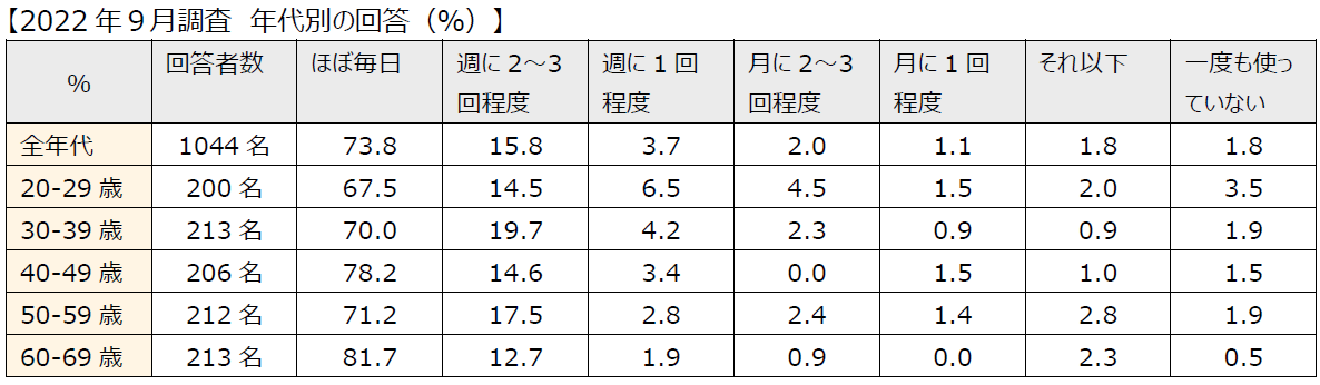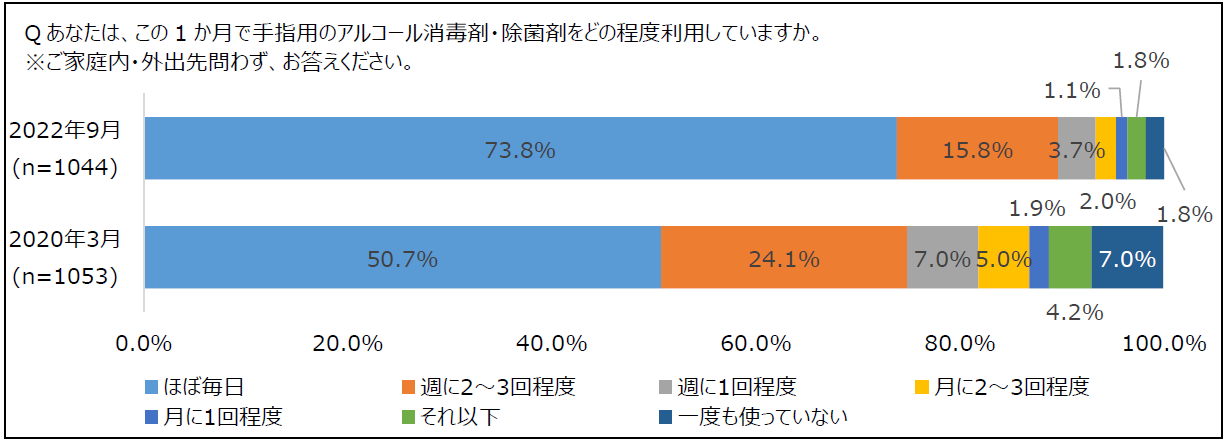 ■一方、アルコール消毒剤や除菌剤を「ほぼ毎日」利用する人は約74%で、2020年3月と比較して20ポイント以上増加しています。