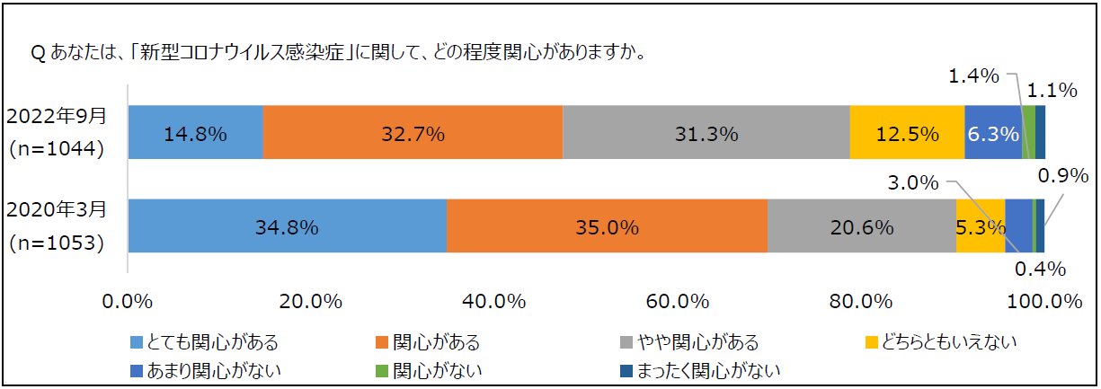 「新型コロナウイルス感染症」に関して、どの程度関心があるか尋ねたところ、「とても関心がある」(14.8%)「関心がある」(32.7%)「やや関心がある」(31.3%)を合わせると、78.8%の人が「関心がある」と回答しました。2020年3月の調査では、90.4%の人が「関心がある」と回答していることから、10ポイント以上下がっています。