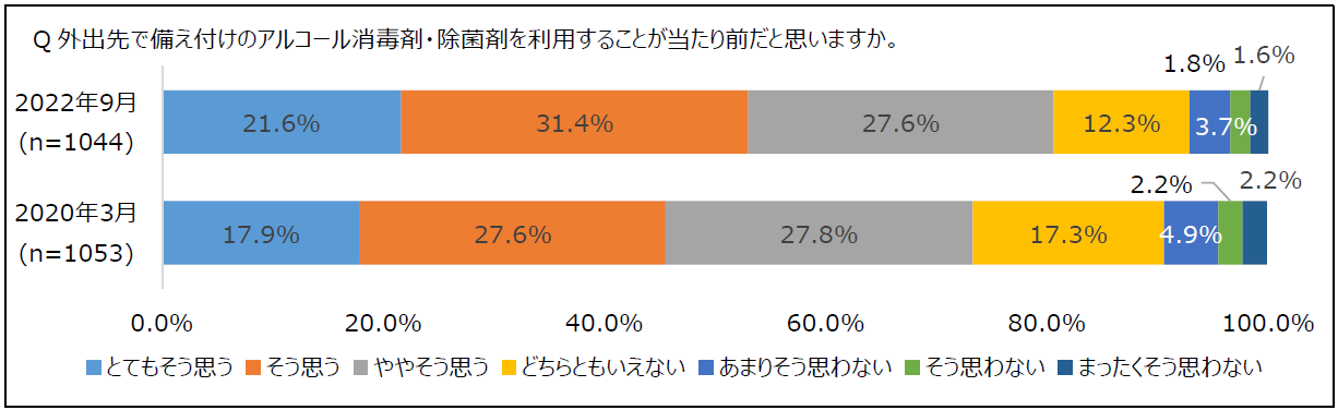 外出先で備え付けのアルコール消毒剤・除菌剤を利用することが当たり前だと思うかについて質問したところ、「とてもそう思う」(21.6%)「そう思う」(31.4%)「ややそう思う」(27.6%)を合わせると、80.6%の人が当たり前だと思っていることが判明しました。2020年3月の調査では、「思う」と回答している人は73.3%だったのに対し、約7ポイント増加しています。