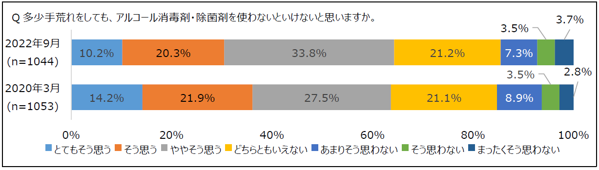 さらに多少手荒れをしても、アルコール消毒剤・除菌剤を使わないといけないと思うかどうかについて尋ねたところ、「とてもそう思う」(10.2%)「そう思う」(20.3%)「ややそう思う」(33.8%)を合わせると、64.3%の人が「思う」と回答しました。2020年3月と比較して、「とてもそう思う」人は4ポイント減ったものの、「そう思う」「ややそう思う」を合わせると、多少手荒れをしても消毒剤・除菌剤を使用すべきと思っている人の割合は63.6%で今年とそれほど変化がありませんでした。