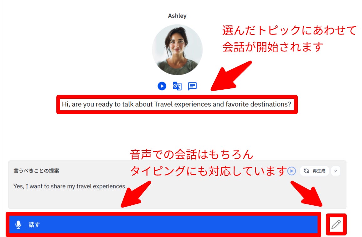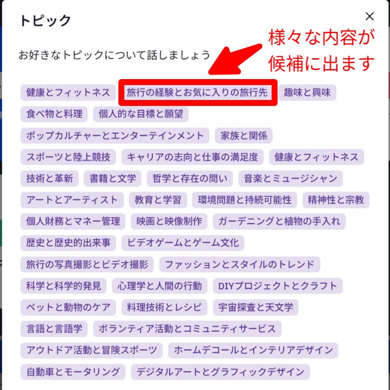 レッスンの復習だけでなく、旅行やスポーツなどお好きなトピックで、 MyBerlitz Speaking Tutorとのフリートークができます。MyBerlitz Speaking Tutorとなら、隙間時間でもすぐに英会話練習ができます。