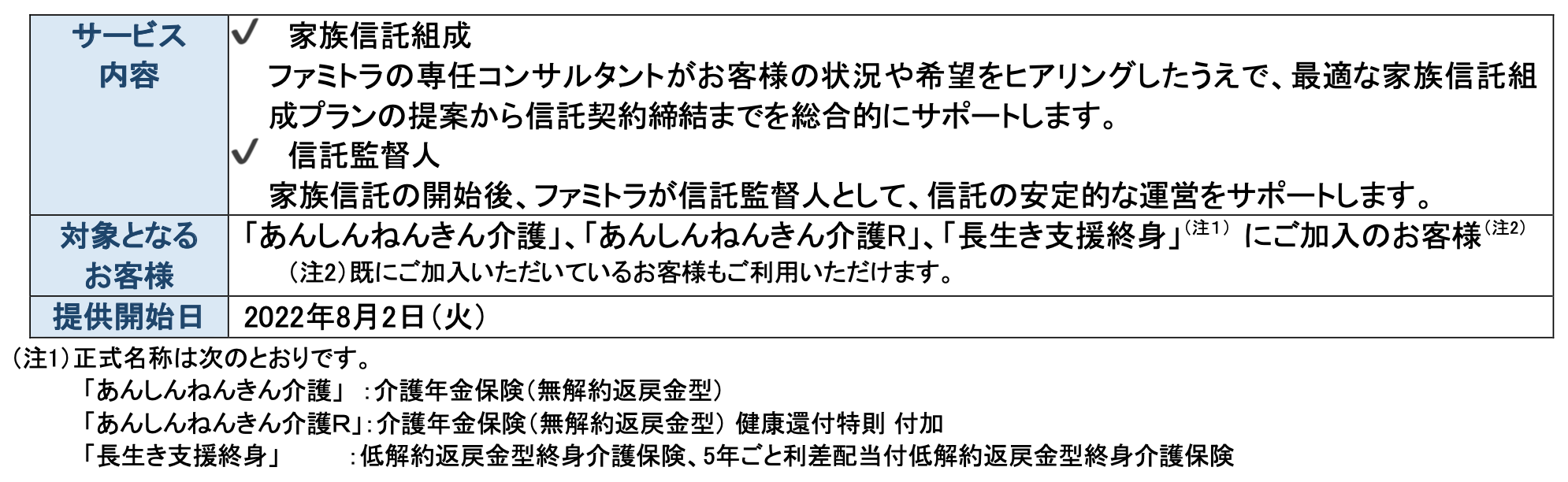 株式会社ファミトラ(代表取締役CEO 三橋克仁、以下「ファミトラ」)は、東京海上日動あんしん生命保険株式会社(取締役社長 川本哲文、以下「東京海上日動あんしん生命」)と提携し、介護や認知症に関する社会課題に備えるべく、各種保険の契約者向けにファミトラの家族信託組成サポートサービスを2022年8月2日に提供開始しましたのでお知らせいたします。