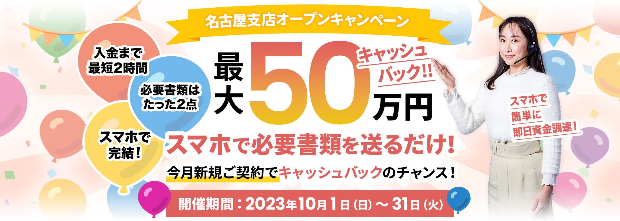名古屋支店オープンを記念して、2023年10月1日(日)~2023年10月31日(火)までの期間限定で(最大)50万円の高額キャッシュバックキャンペーンを行っております。