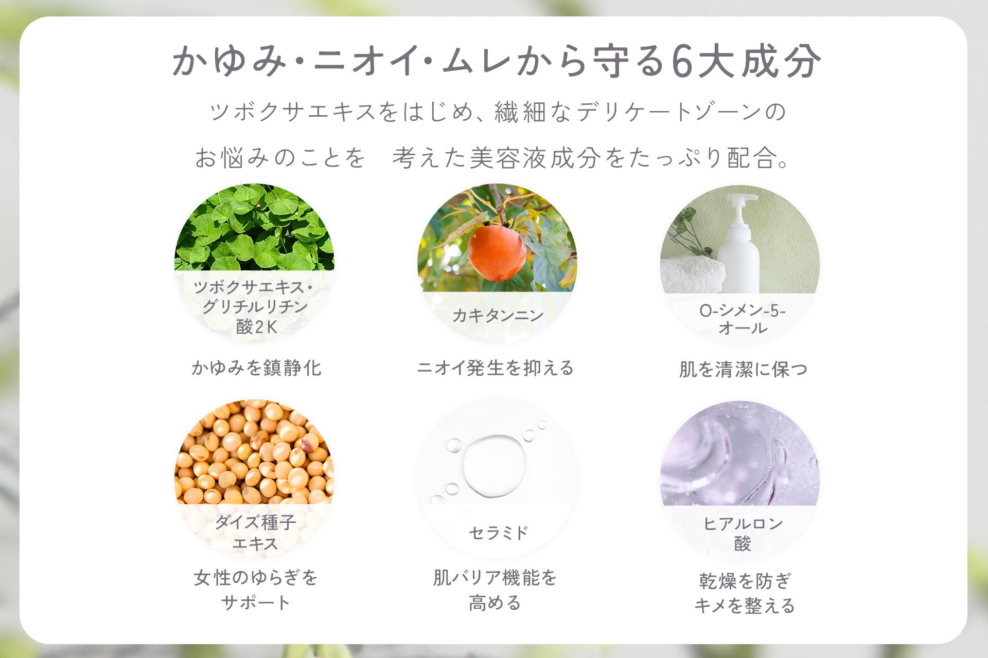デリケートゾーンに起こりがちな乾燥トラブルをケアする保湿成分「ヒアルロン酸」「セラミド」などを贅沢に配合し、デリケートゾーンに潜むお悩みに多角的にアプローチします。