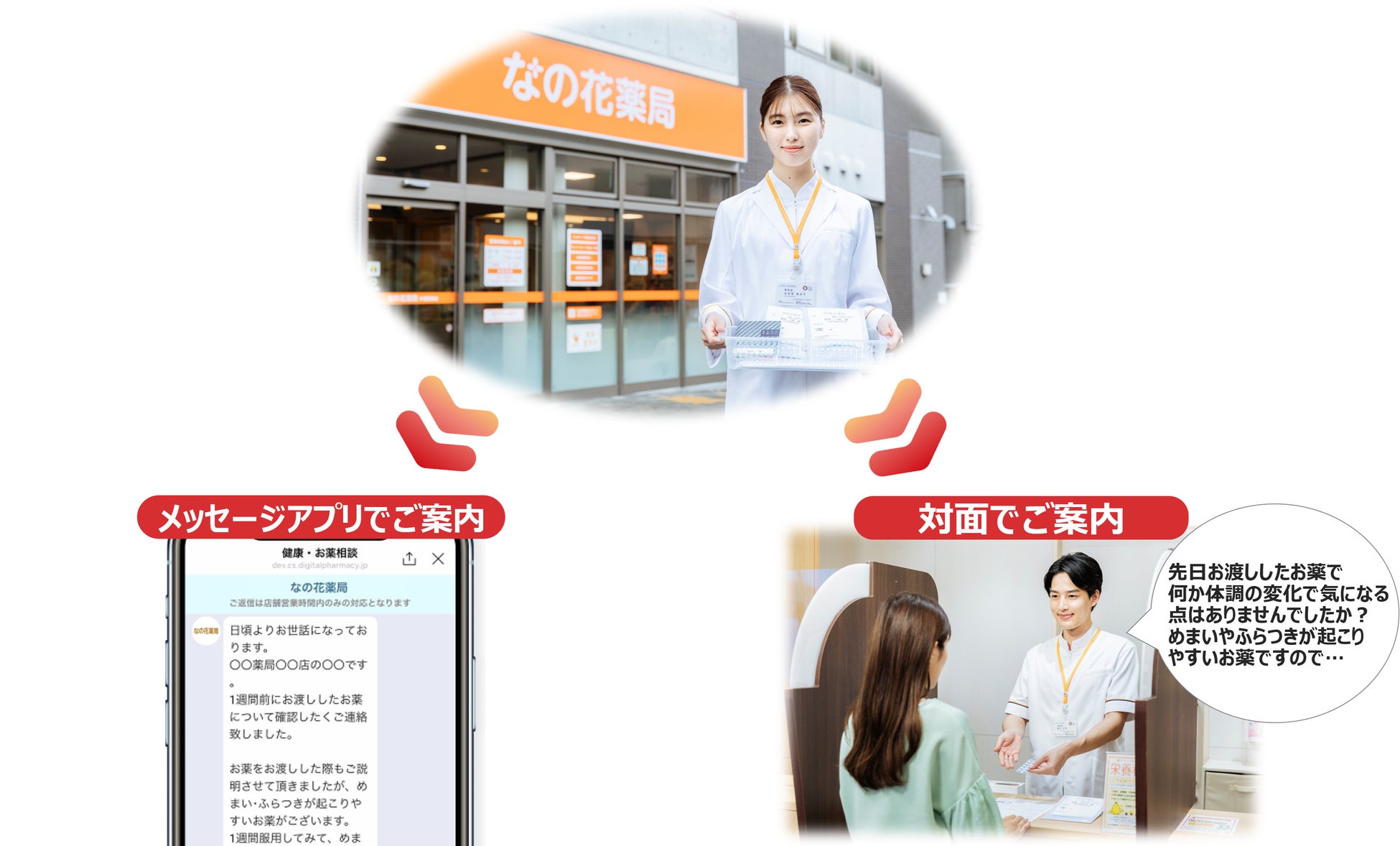 ④ 「なの花薬局」の薬剤師が、患者さまの服用中のお薬、来局時の状況、患者さまの生活の傾向、算出されたスコア情報等を照らし合わせ、必要に応じて患者さまにメッセージアプリやお電話、もしくは対面で服薬フォローアップを実施します。