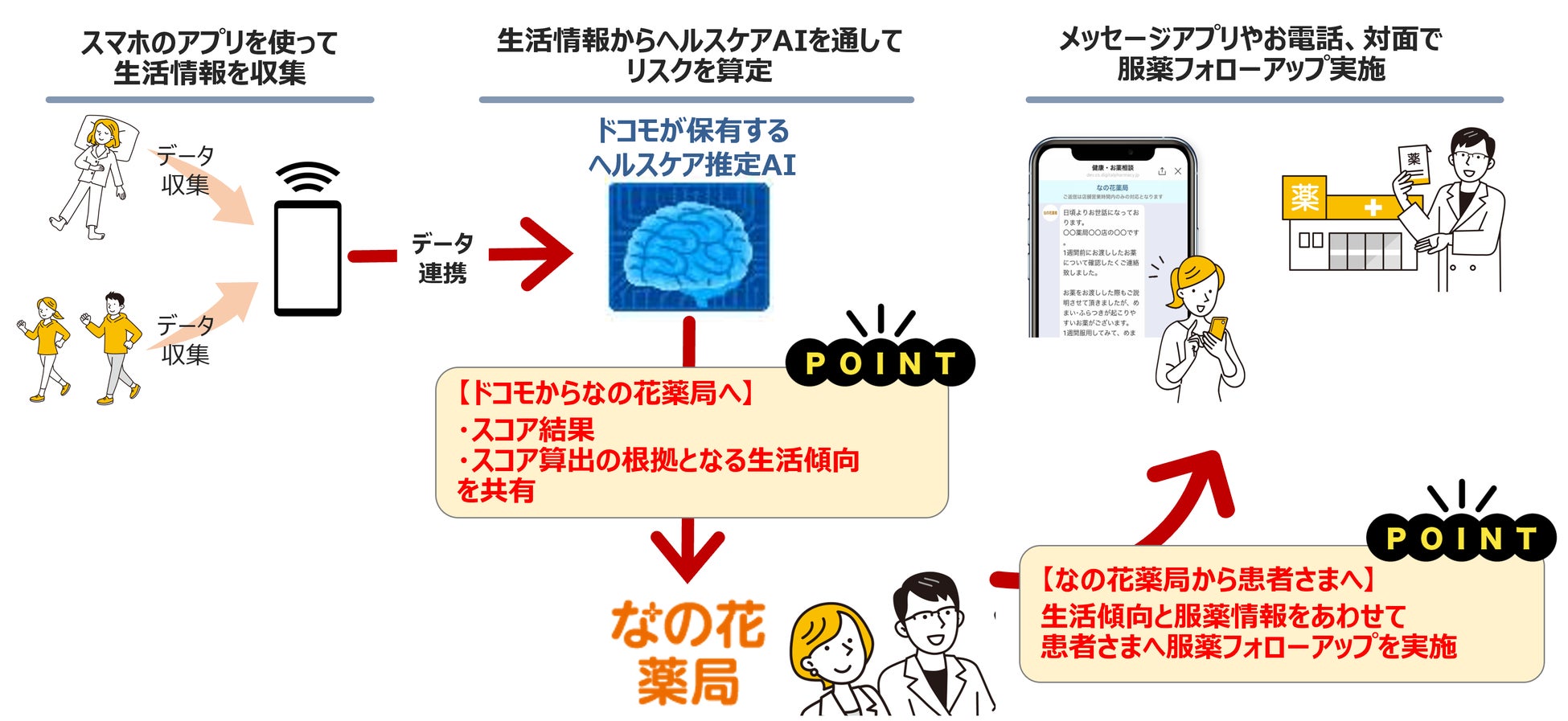 ドコモとメディカルシステムネットワーク、「なの花薬局」においてヘルスケア推定AIを活用した服薬フォローアップの実証事業を開始