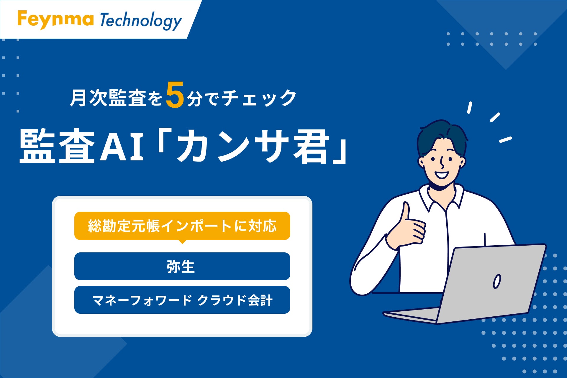 株式会社Feynma Technology(ファイマテクノロジー|名古屋市東区、代表取締役 土屋太助)は、税理士のミカタ監査AI「カンサ君」で、弥生会計とマネーフォワードクラウド会計の総勘定元帳のインポートに対応いたしました。